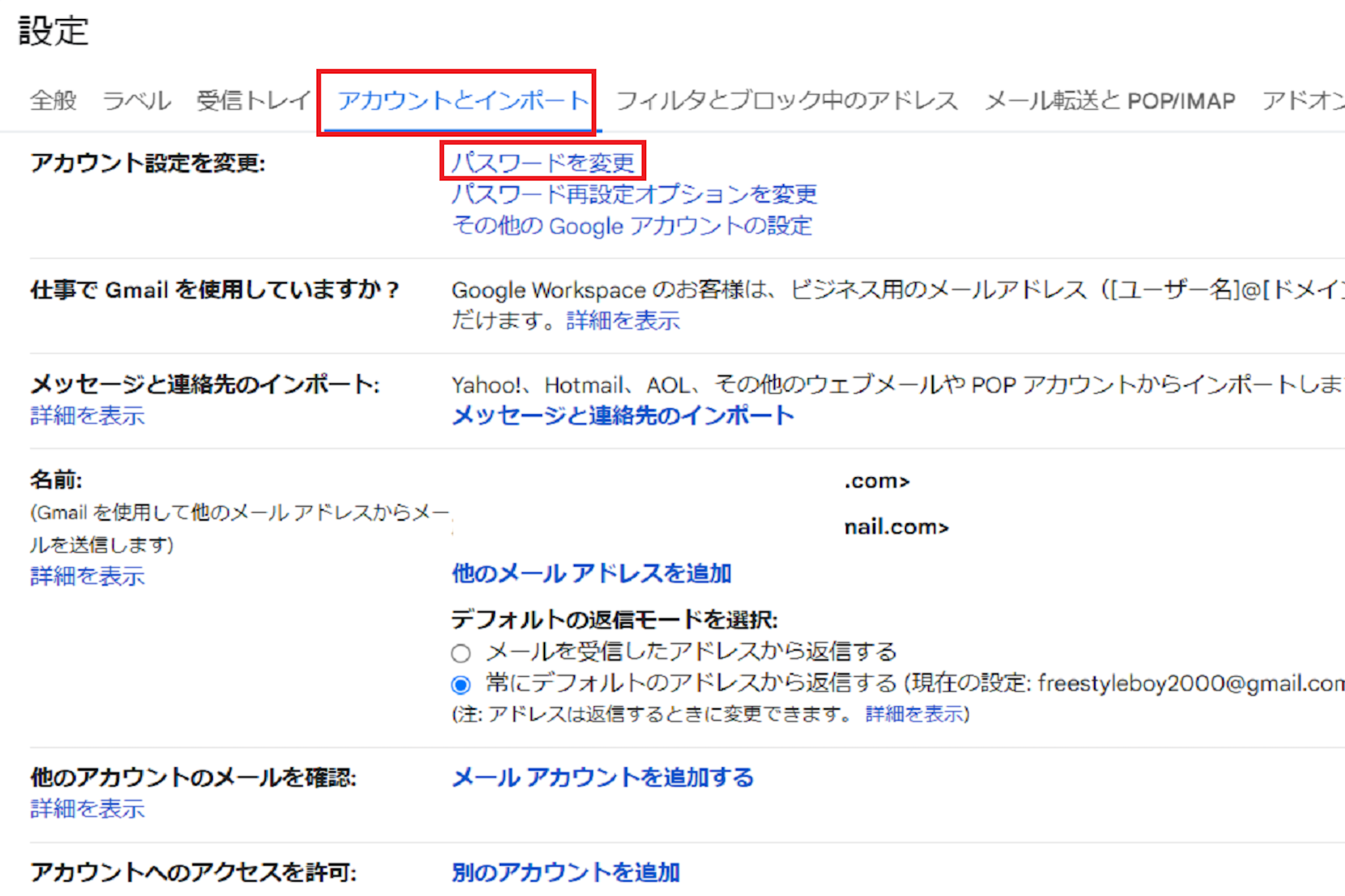 設定画面が表示されたら、「アカウントとインポート」タブから「アカウント設定を変更」セクションにある「パスワードを変更」を選択しましょう。