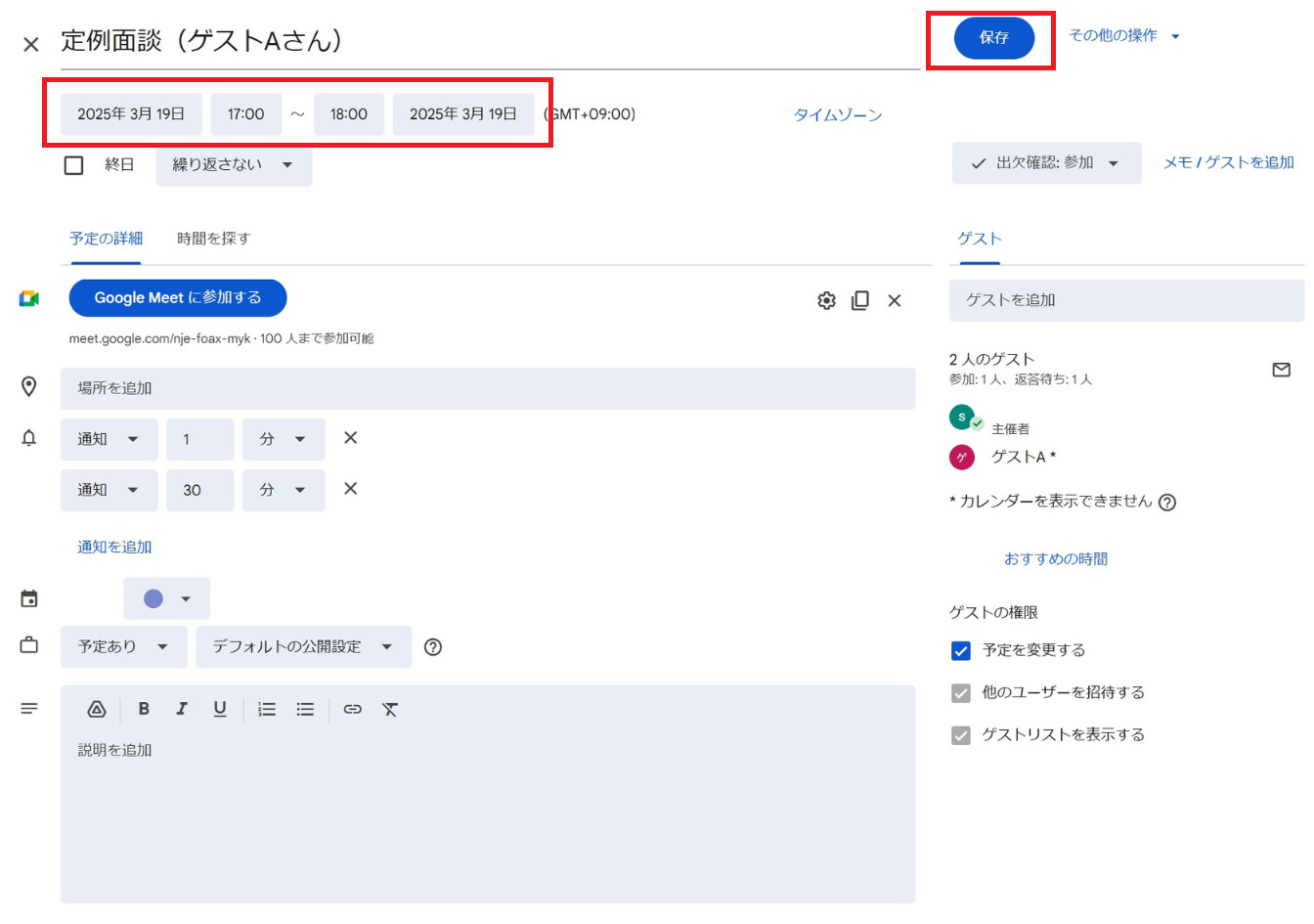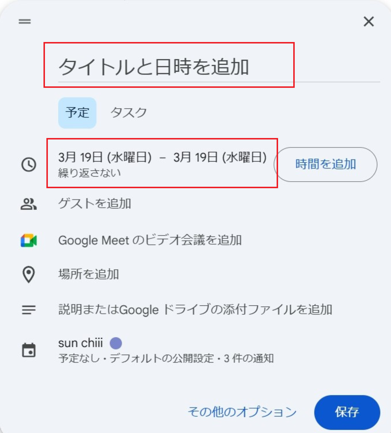 なお、Google Workspaceの最新機能として、AI(Gemini)が参加者の空き状況やタイムゾーンを考慮して最適な日時を提案してくれる機能も順次実装されていますが、ここでは基本的な手動操作について解説します。