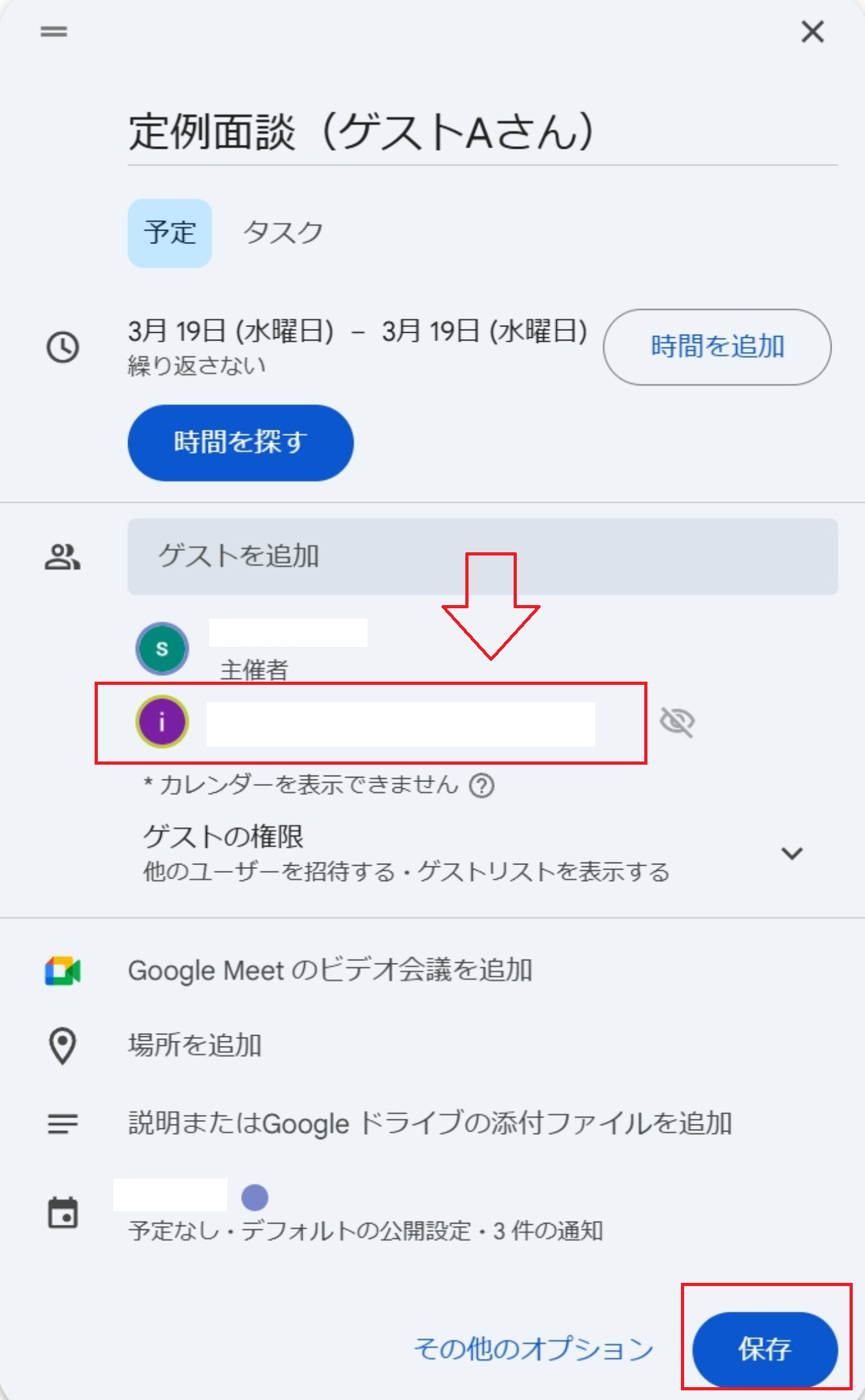 メールアドレスで招待するため、Googleカレンダーを使っていない人や、外部のゲストも招待することができます。