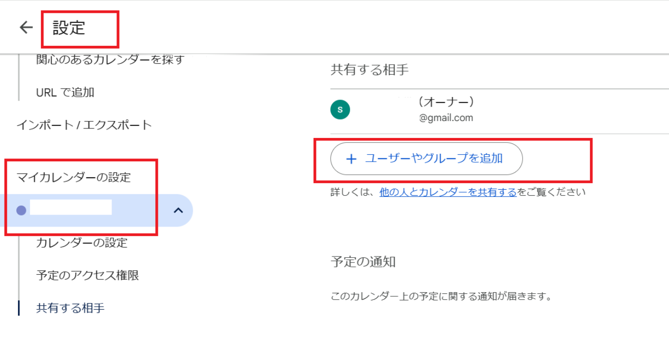 先ほどは予定からゲストを招待しましたが、特定のグループやメンバーを自分のカレンダー自体に招待する方法もあります。チームメンバーなどいつも同じメンバーで共有する場合は、こちらの方法がより効率的です。
