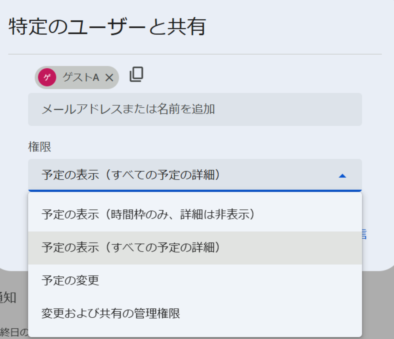 権限の設定は予定を見られる範囲だけでなく、予定を変更できる権限や、変更・共有の変更権限まで設定が可能になっています。会社であれば一般社員は予定の閲覧のみ、リーダー以上の管理職に変更権限を付与するなどで、使い分けるとよいでしょう。