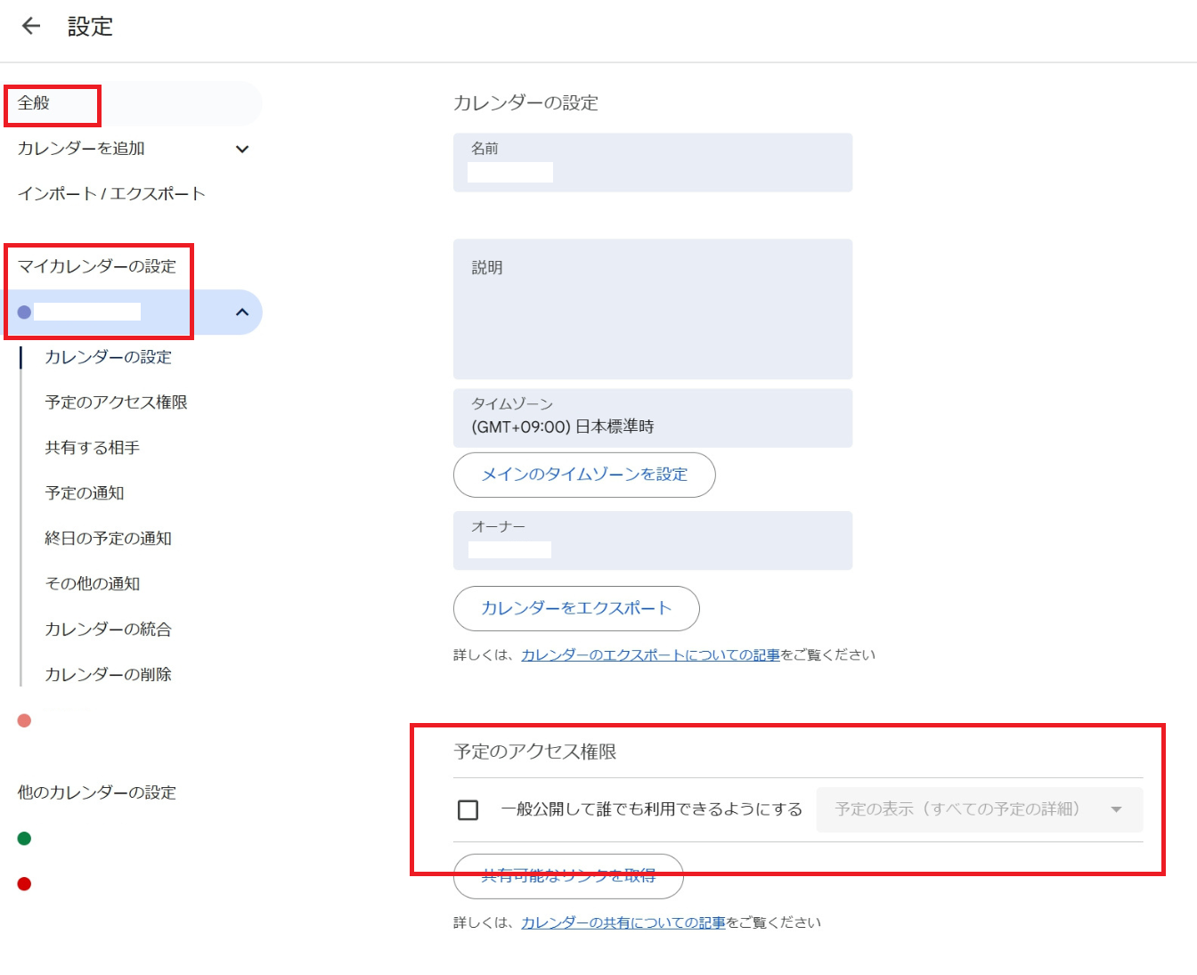 予定を一切公開しない場合は、「一般公開」の手順で「一般公開して誰でも利用できるようにする」のチェックを外します。