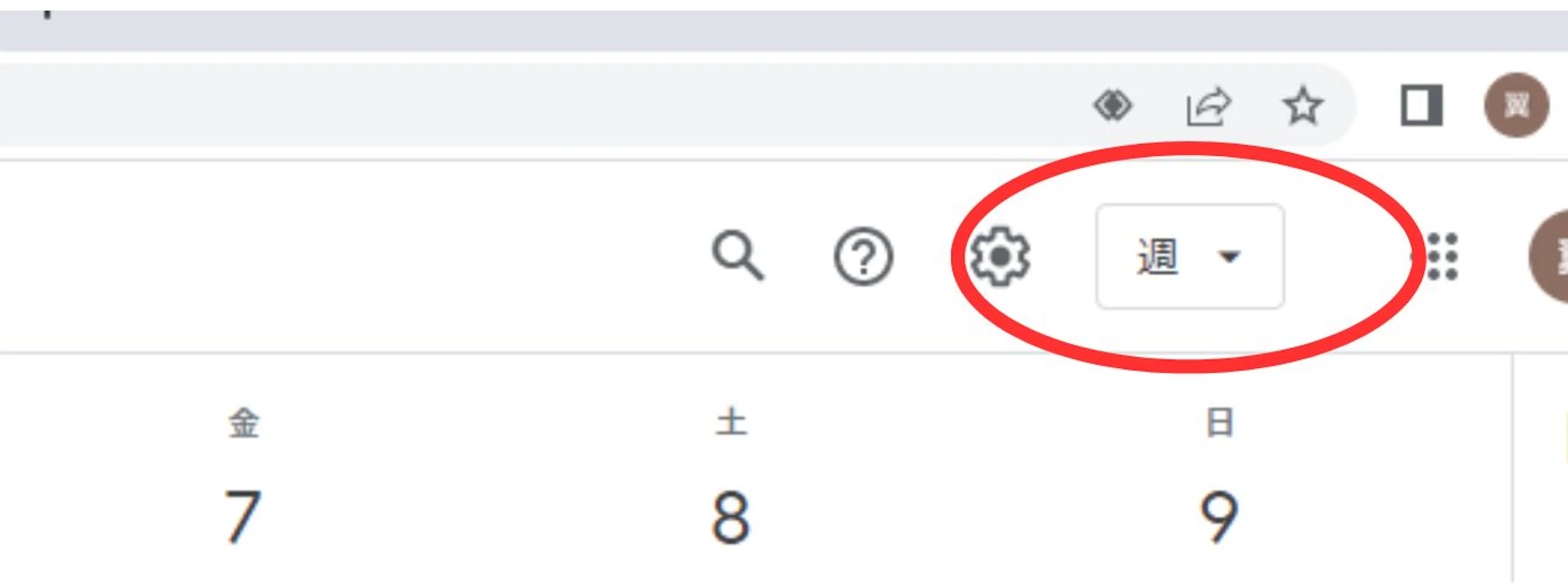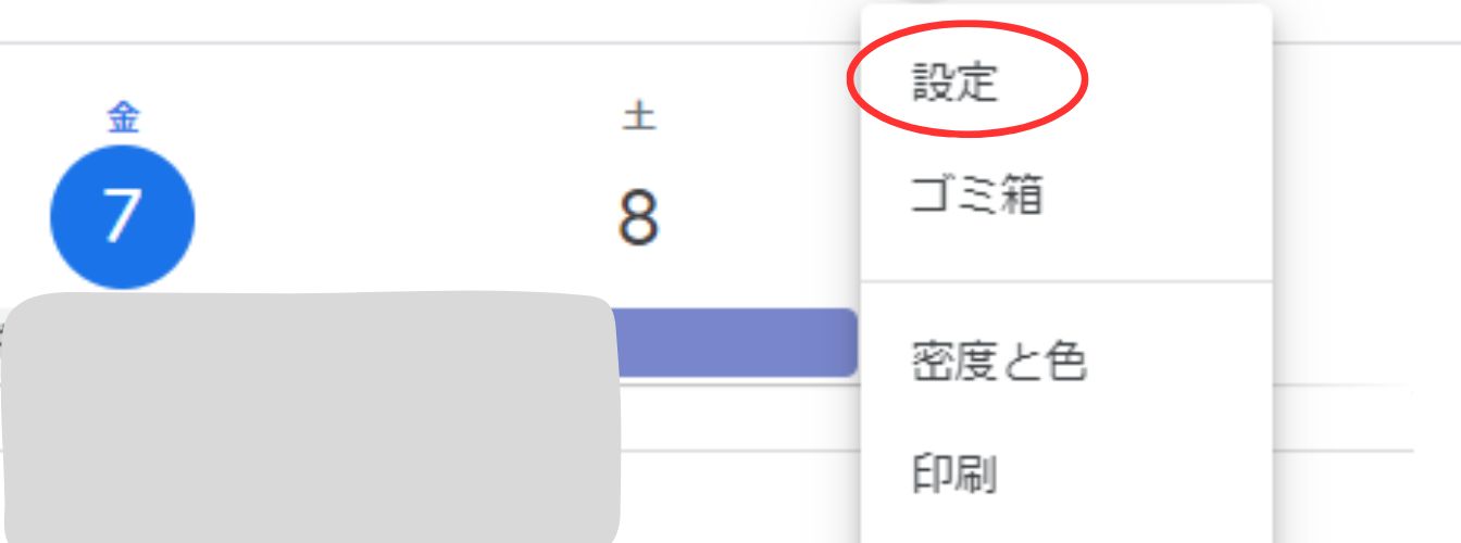 まず、始めにGoogleカレンダーの右上にある「歯車の形をしたマーク」をクリックします。