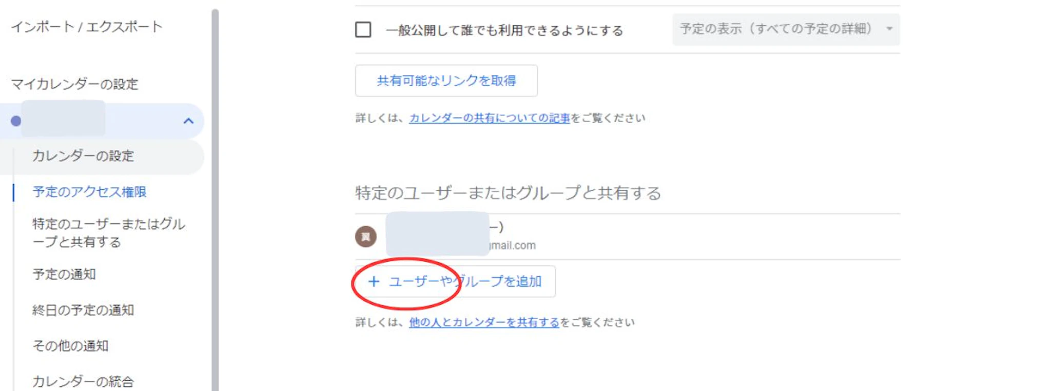 マイカレンダーの設定画面では、必ず「特定のユーザーとの共有」を選択し、共有したい相手のメールアドレスを個別に追加してください。「一般公開」にはしないよう徹底しましょう。
