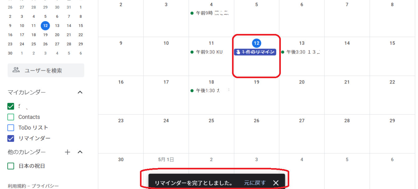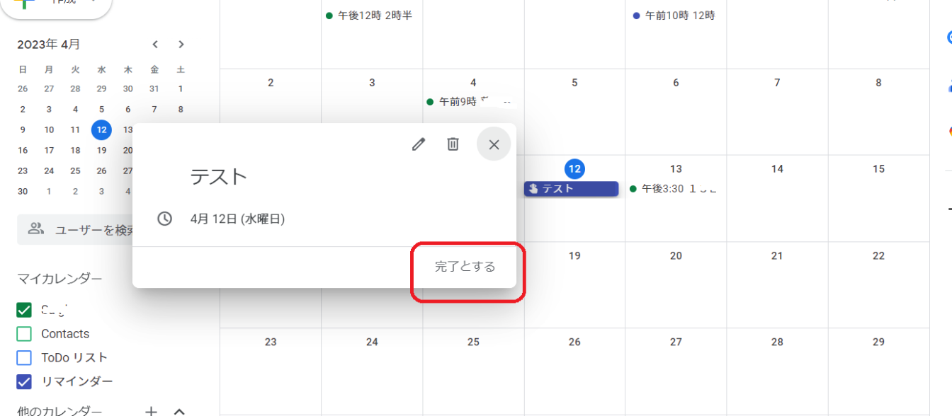 Googleカレンダーのリマインダーは、きちんと「完了とする」をクリックする必要があります。