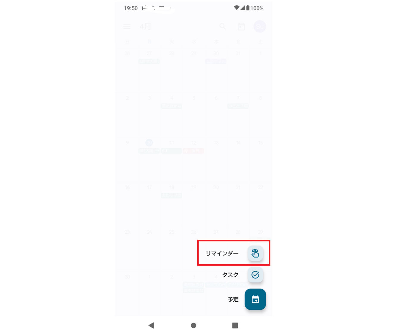 すると、3種類の選択肢が表示されるので、上部の「リマインダー」をクリックしましょう。