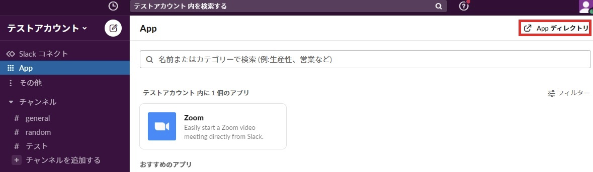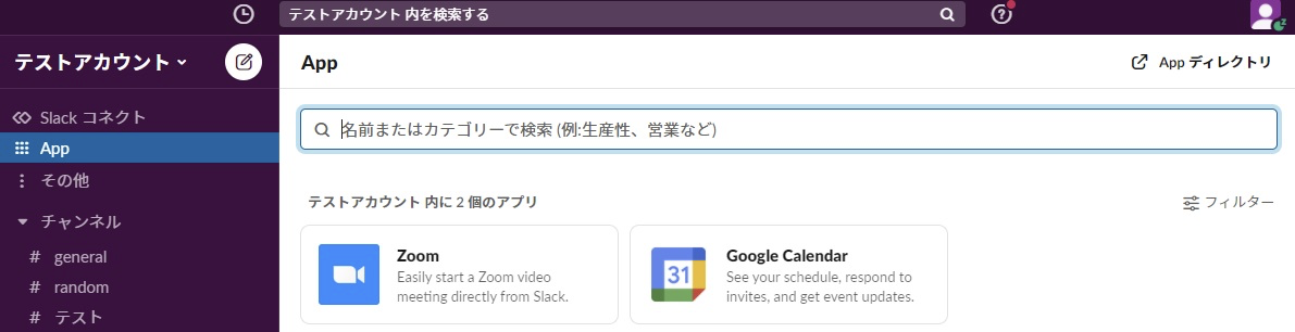 Slackの管理画面にて「App」を開くと、Googleカレンダーが追加していることがわかります。