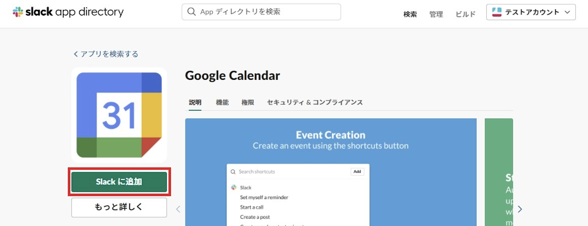 「Googleカレンダー」アプリを見つけたら「Slackに追加」をクリックしましょう。