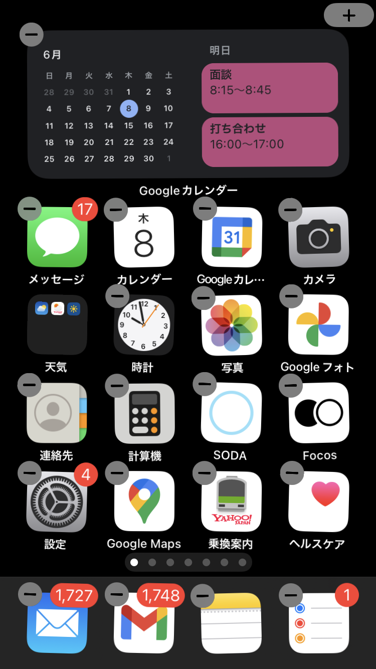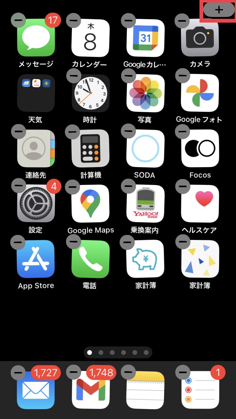 アプリが小刻みに振動して、ホーム画面の編集に切り替わります。左上(または右上)にプラスマークが見えるので、タップしましょう。