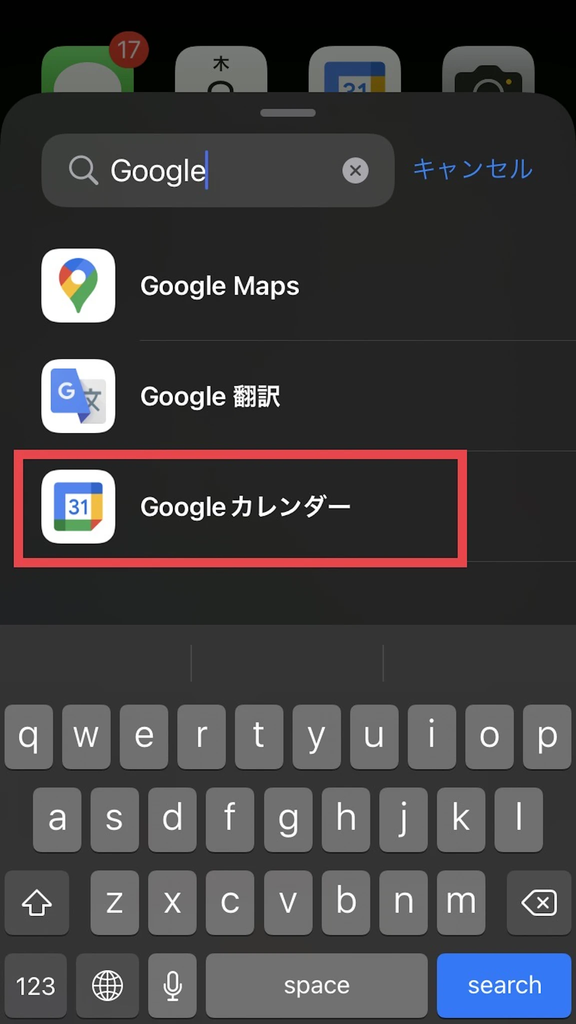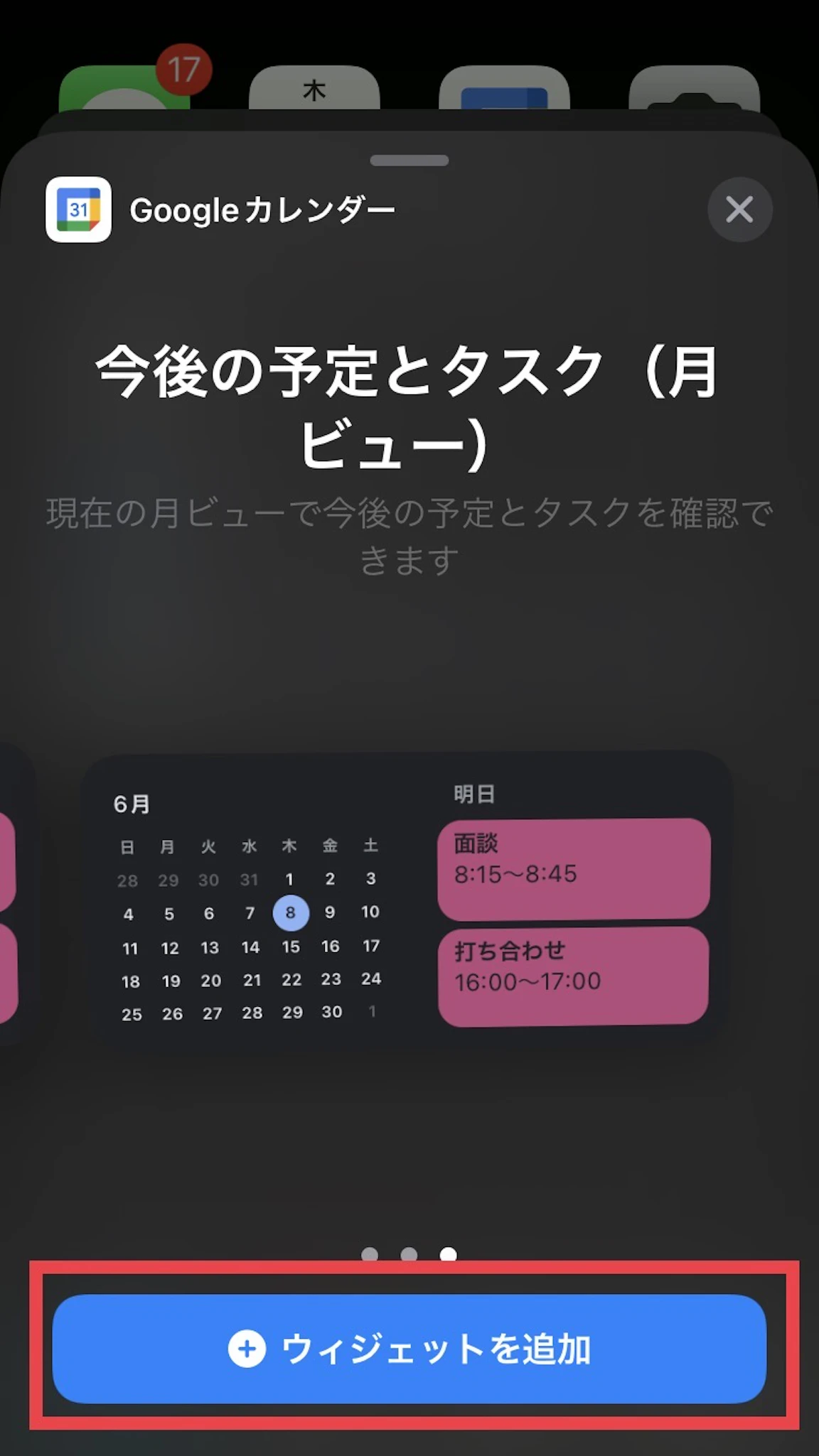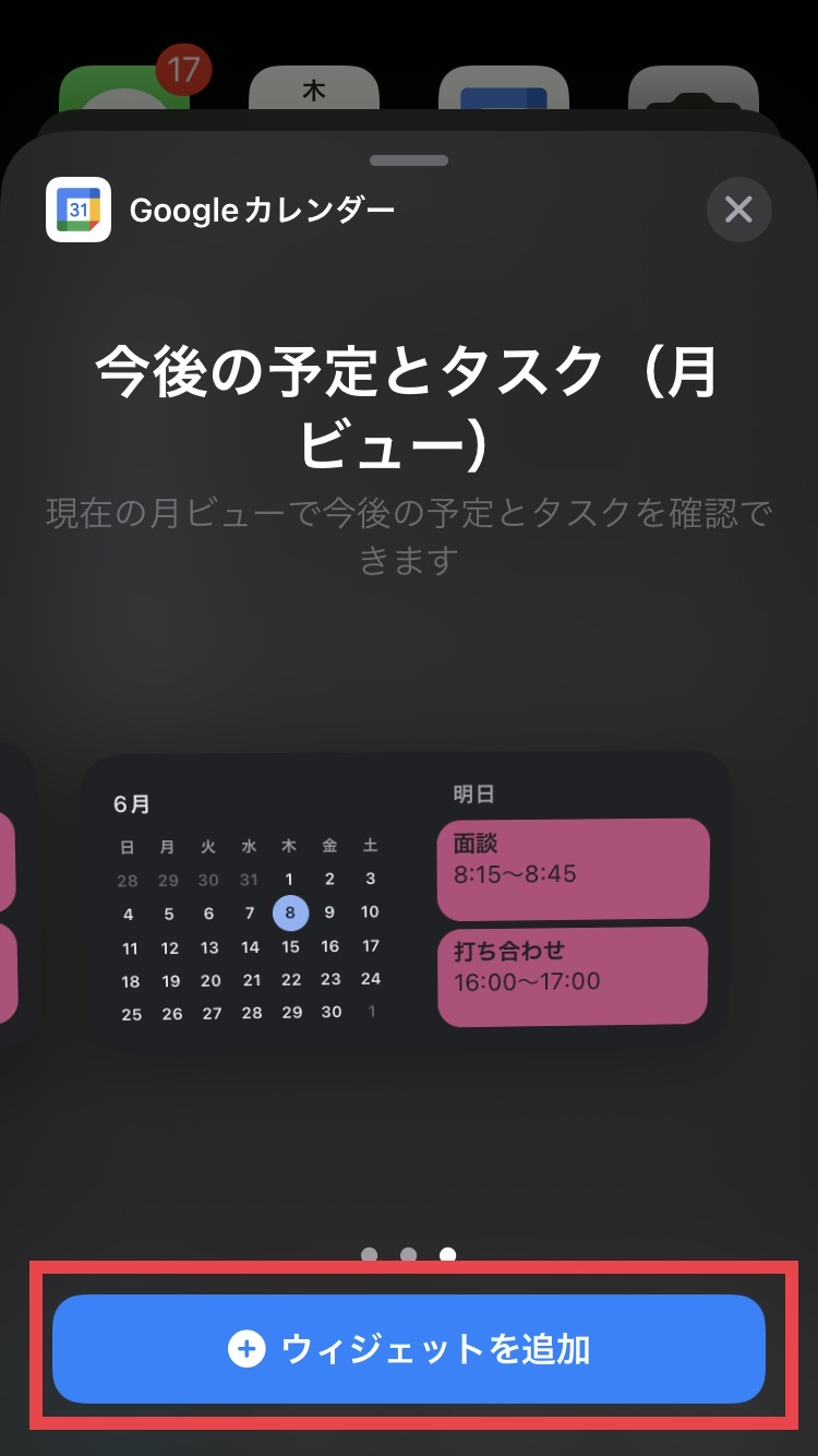 「ウィジェットを検索」と出てきますので、Googleカレンダーを検索して選択します。