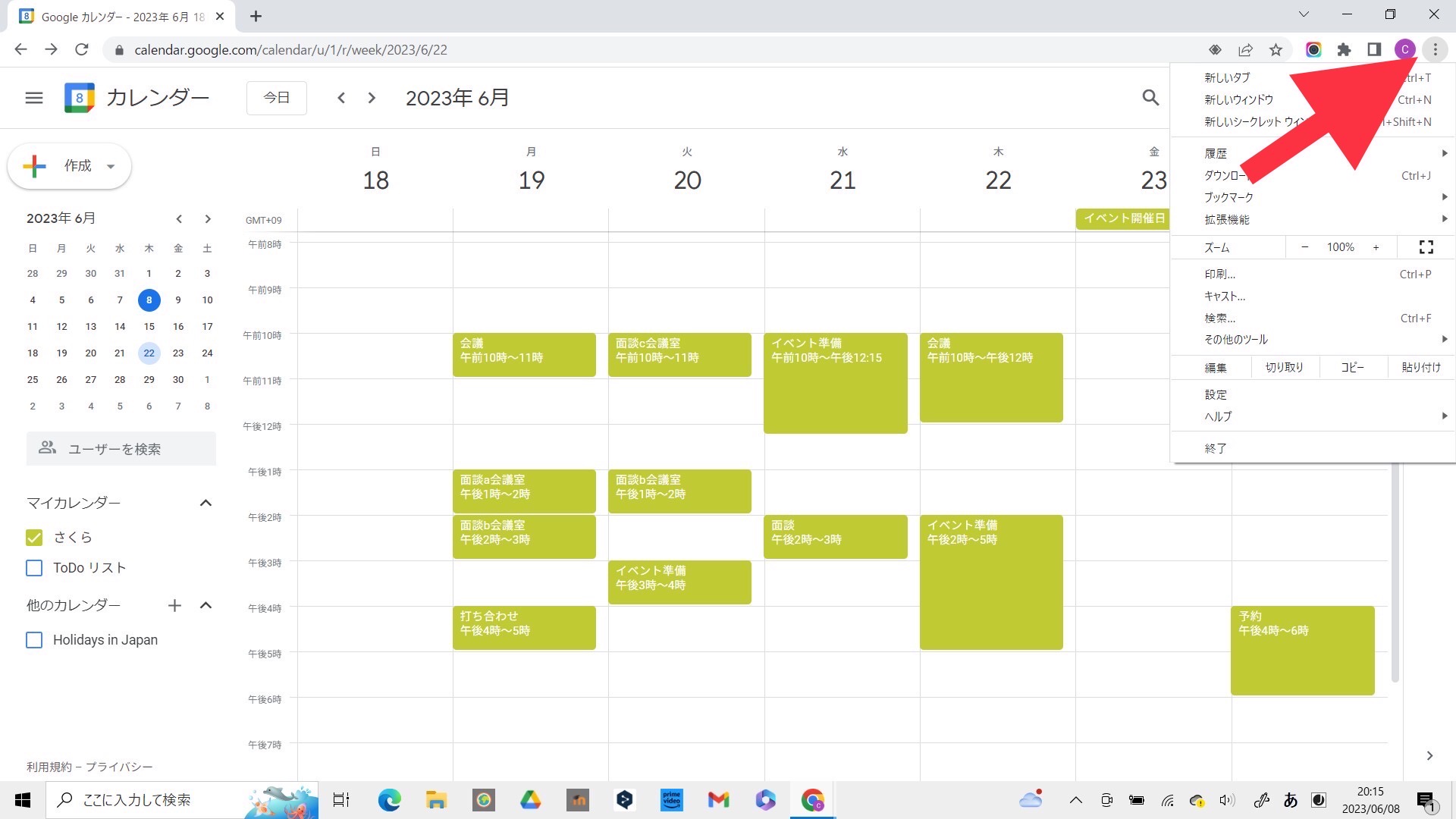 まず、PCのChromeでGoogleカレンダーを開き、ショートカットで開きたい画面(月間や週間など)を表示させます。