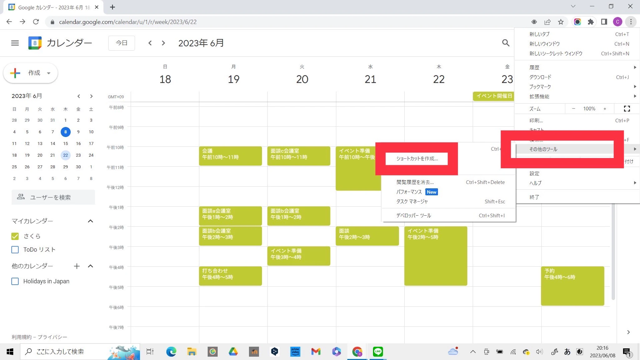 次に、Chrome画面の右上にある3つの点(メニュー)をクリックして、「保存して共有(またはその他のツール)」から「ショートカットを作成」を選択します。