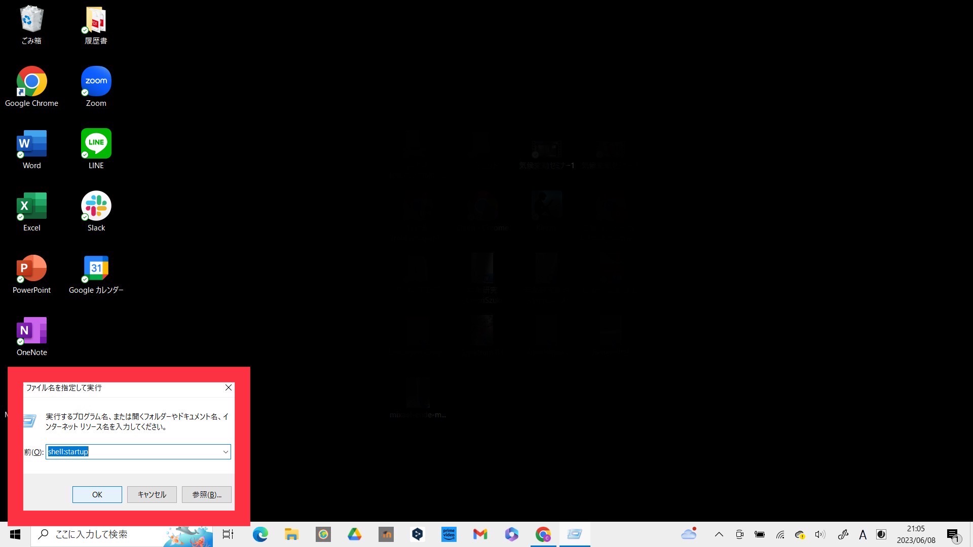 デスクトップにショートカットが表示されたら、キーボードの「Windowsマーク」と「R」を同時に押します。画面左下に「ファイル名を指定して実行」という小窓が出ますので、「shell:startup」と入力して「OK」をクリックしてください。
