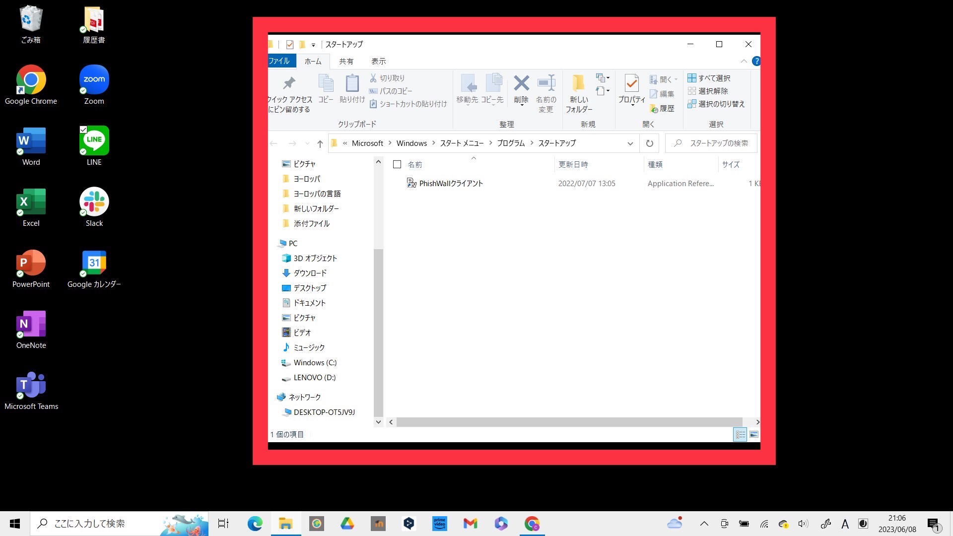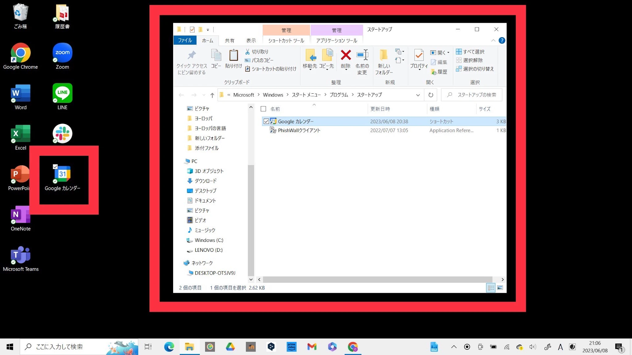 スタートアップのフォルダ画面が開きますので、デスクトップにあるGoogleカレンダーのショートカットをコピー(Ctrl+C)し、スタートアップフォルダ内にペースト(Ctrl+V)します。