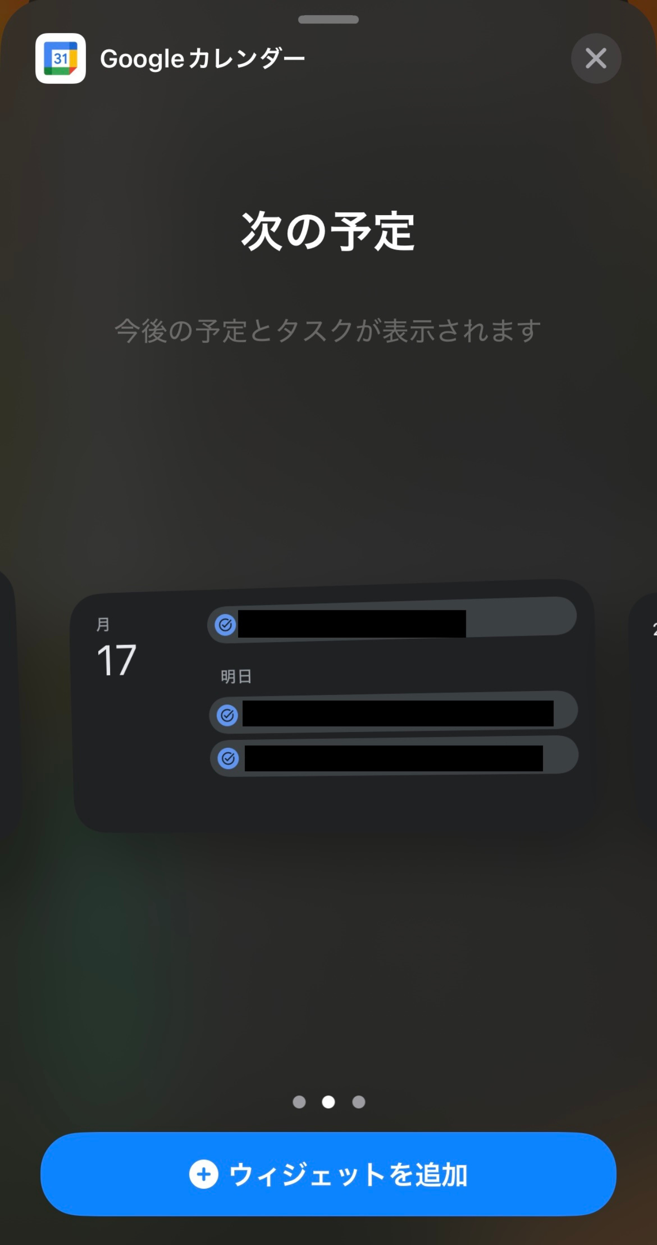 Googleカレンダーをウィジェットに追加する際、表示パターンが3つ出てきます。見やすいパターンを選んでみてください。