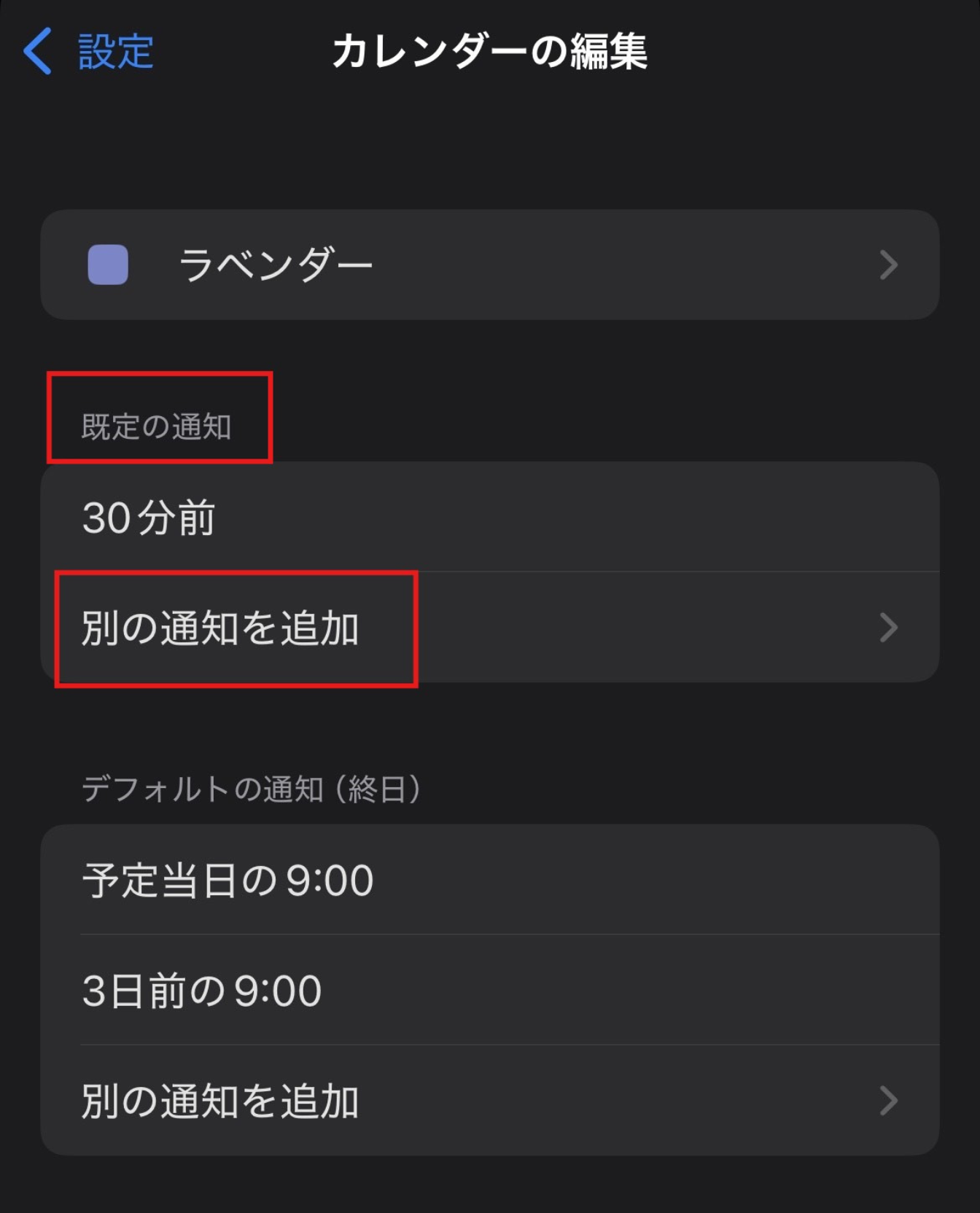 iPhoneの場合「既定の通知」と「デフォルトの通知(終日)」の2か所で設定ができます。