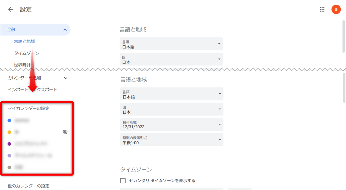 下の方にスクロールすると、カレンダー名が表示されます。非表示にするカレンダーのチェックボックスをオフにします。