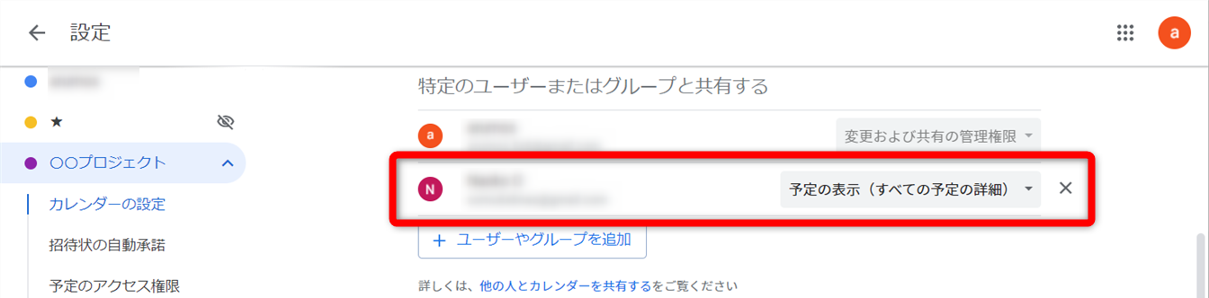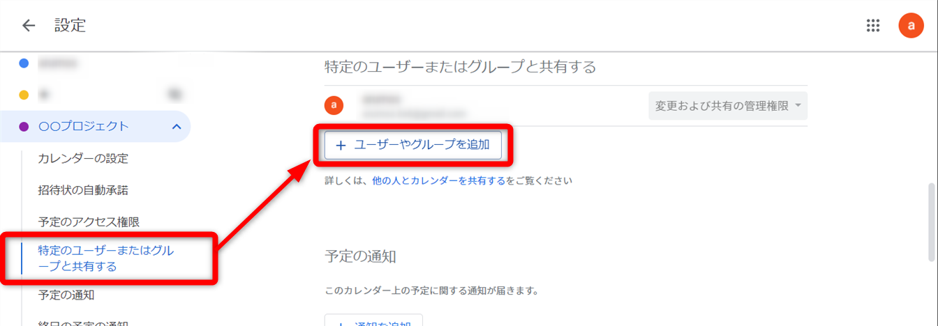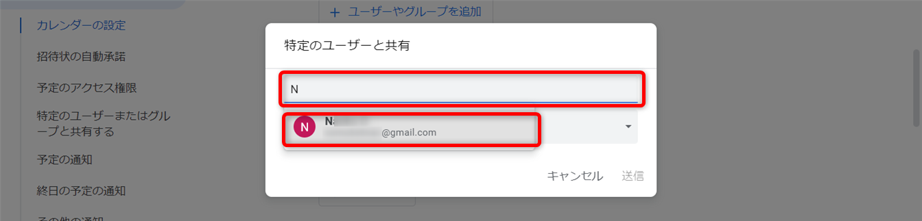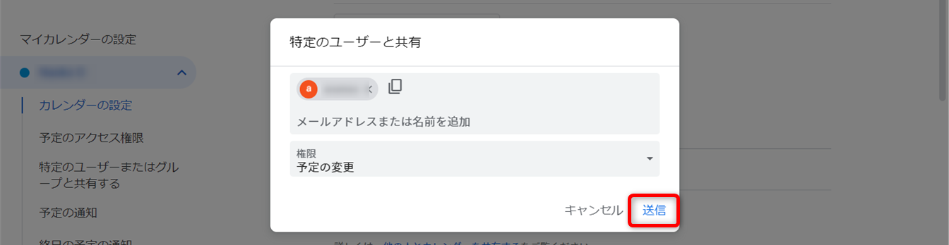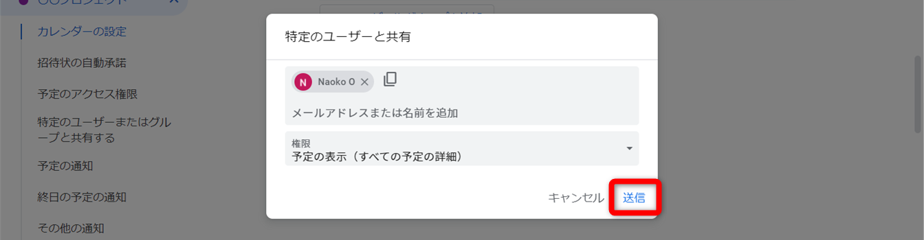 リンクをクリックすると、カレンダーの設定にある共有ユーザーを追加する設定が開きます。