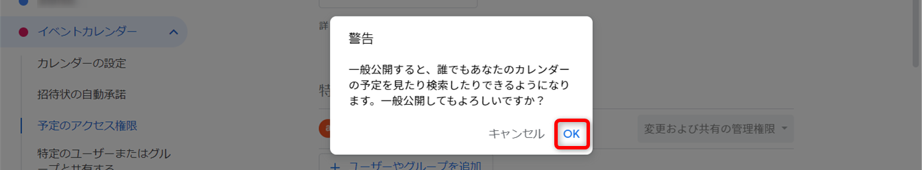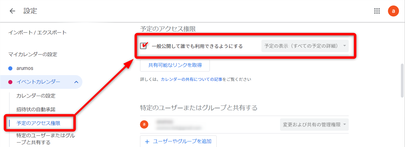 [予定のアクセス権限]をクリックし[一般公開して誰でも利用できるようにする]にチェックを入れます。