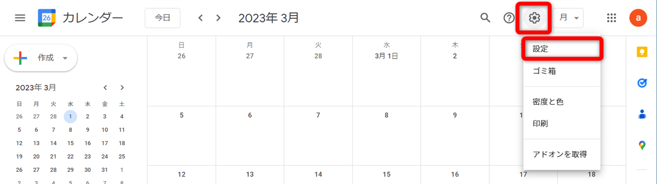 Googleカレンダー[設定(歯車マーク)]から[設定]を開きます。
