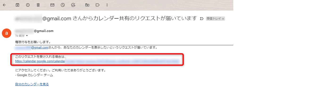 権限をリクエストしたaさんに「Nさんがあなたとカレンダーを共有しました」というメールが届きます。