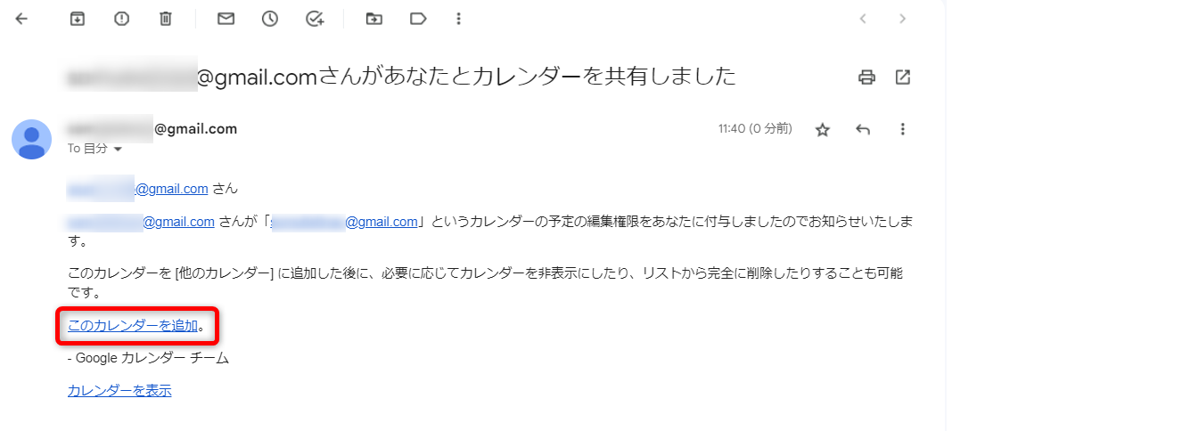同期相手はメール文にある[このカレンダーを追加]をクリックすると、自分のカレンダーに共有されたカレンダーが表示されます。