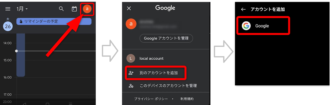 チェック2を行っても同期されない場合は、一度Googleカレンダーアプリから同期されないカレンダーのアカウントを削除します。