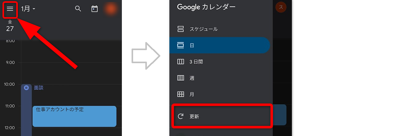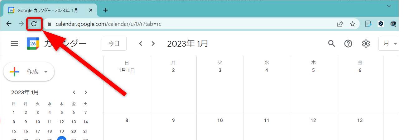 Googleカレンダーを開いて、更新ボタンを押してみましょう。