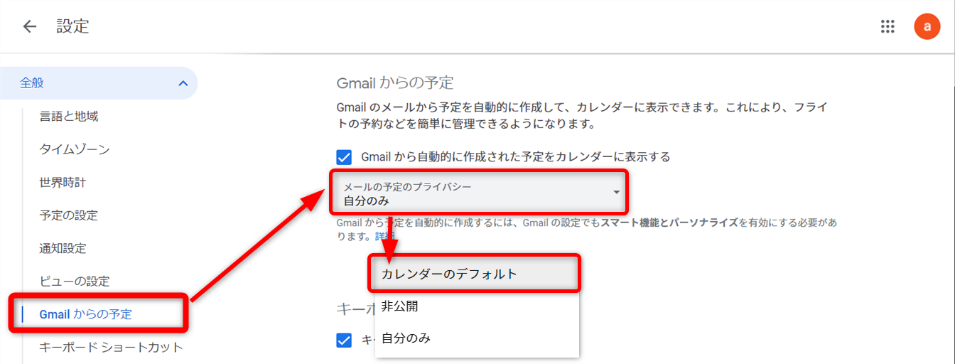メールの予定のプライバシーを[カレンダーのデフォルト]に変更します。