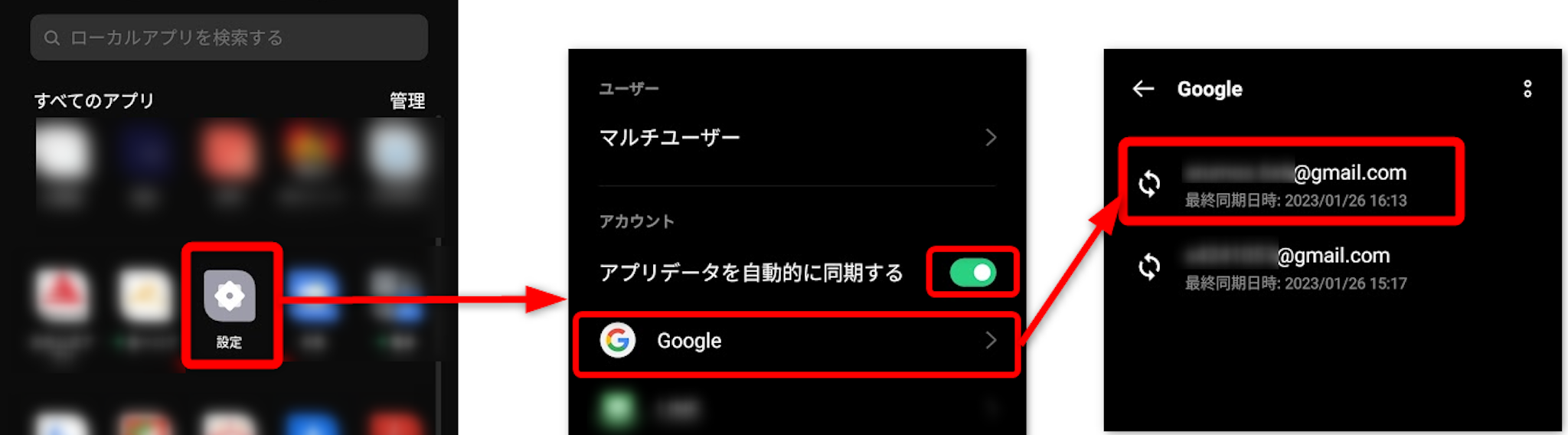 同期を確認したいGoogleアカウントをタップします。