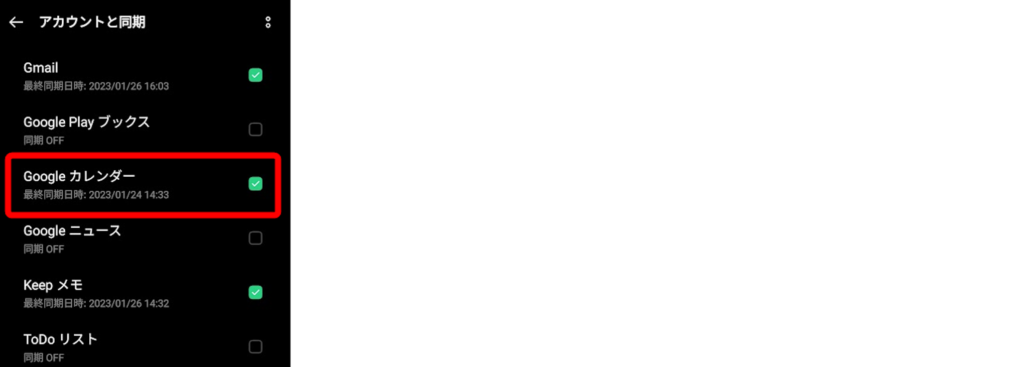 Googleのサービス一覧から「カレンダー」を探し、チェックがオンになっているか確認します。オフの場合はオンにします。