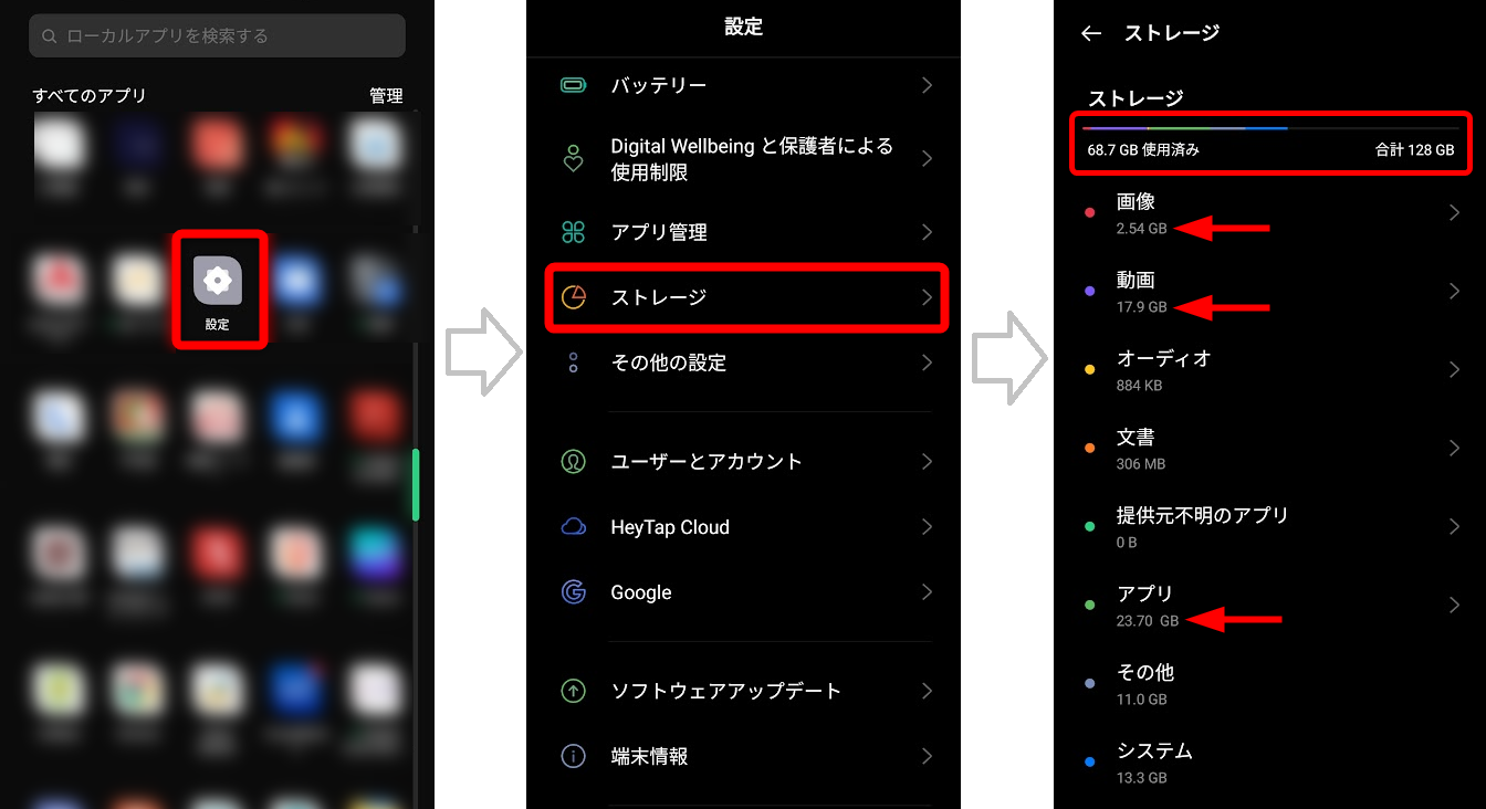 チェック2までおこなっても同期しない場合は、スマホのストレージ不足の可能性があります。