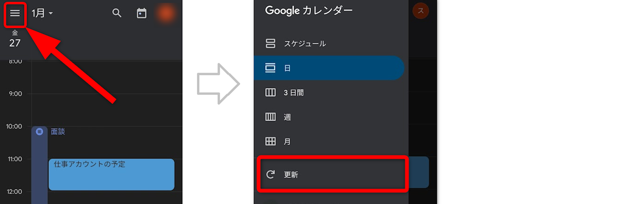 表示するカレンダーを選択する場合は、画面左上[三本線メニュー]を開きます。