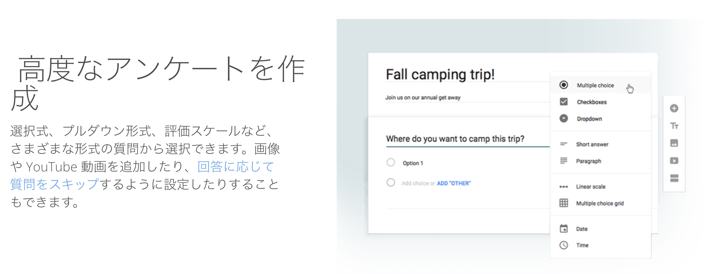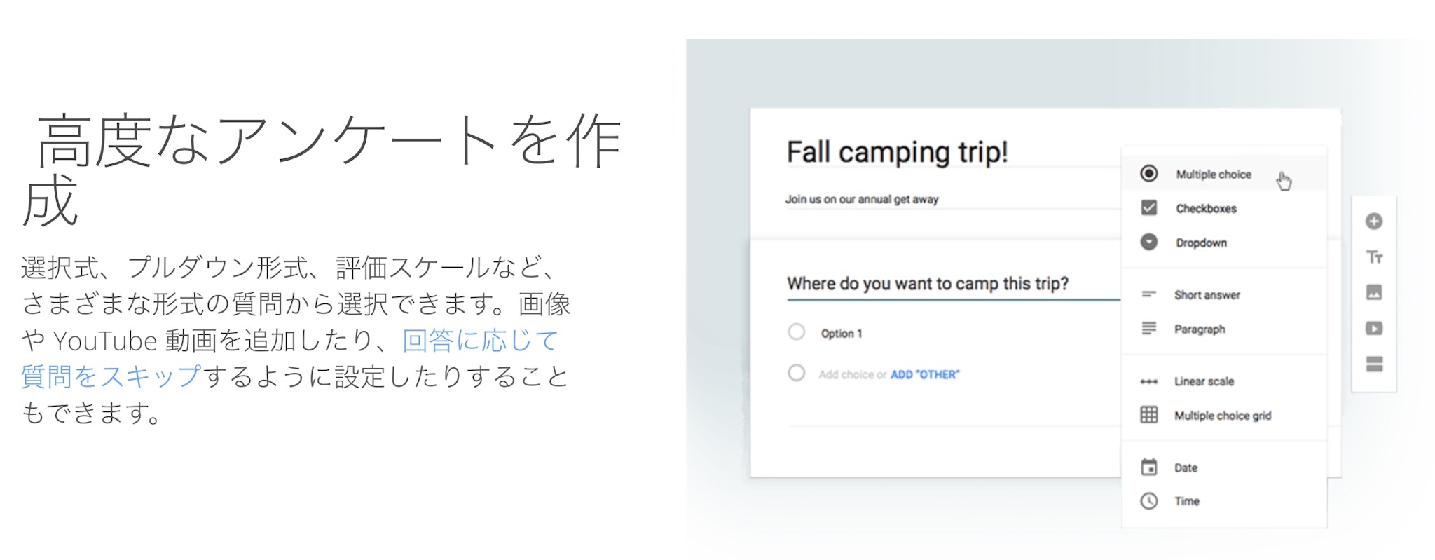 Googleフォームは回答項目を自由にカスタマイズすることができます。