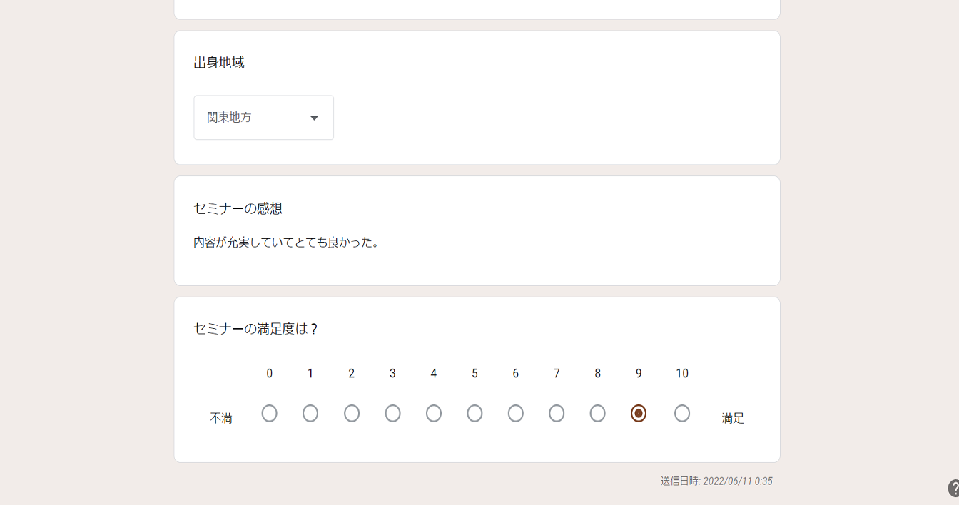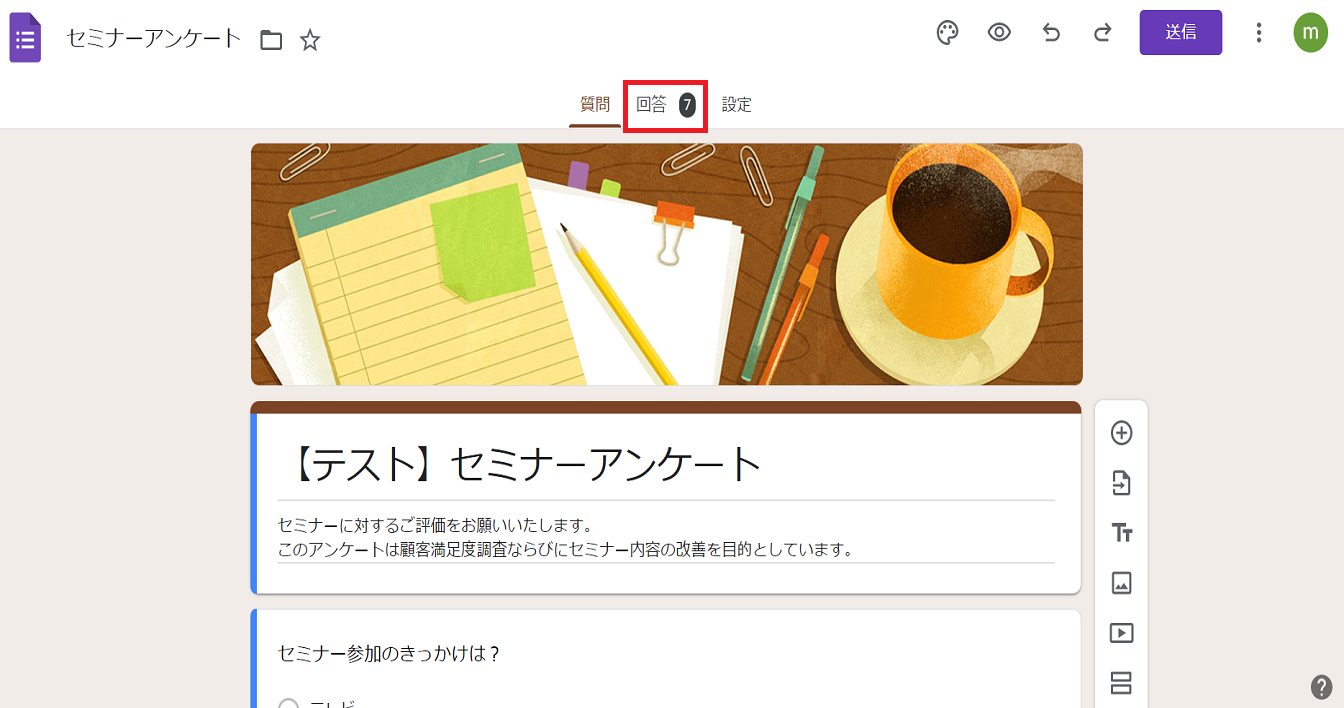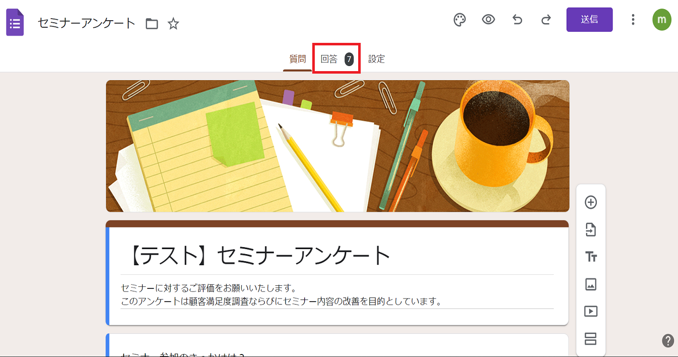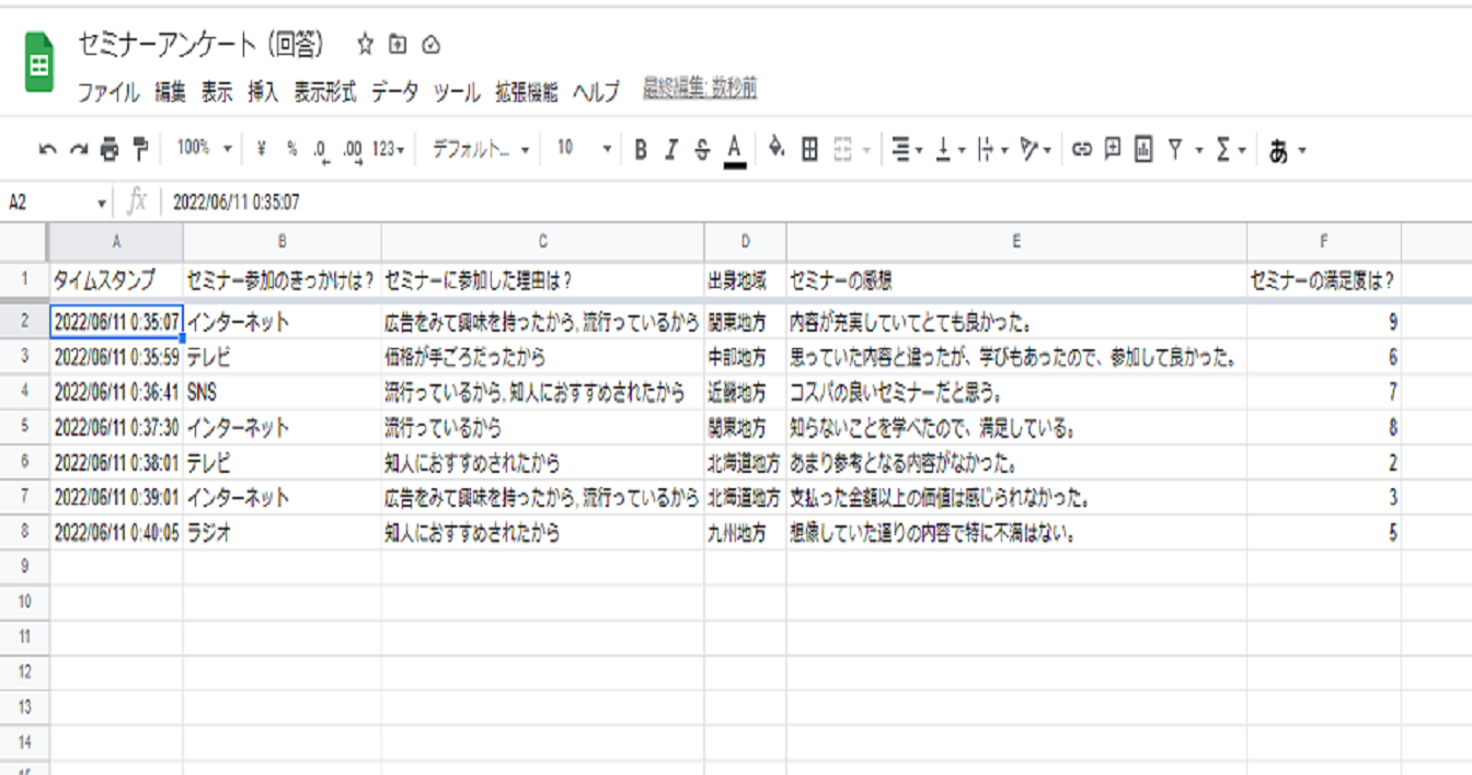 今回は例としてセミナーアンケートというフォームの回答結果の確認をおこないます。