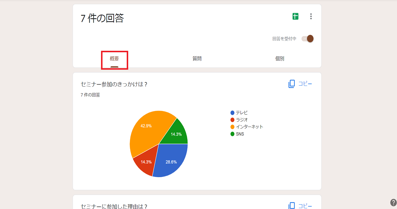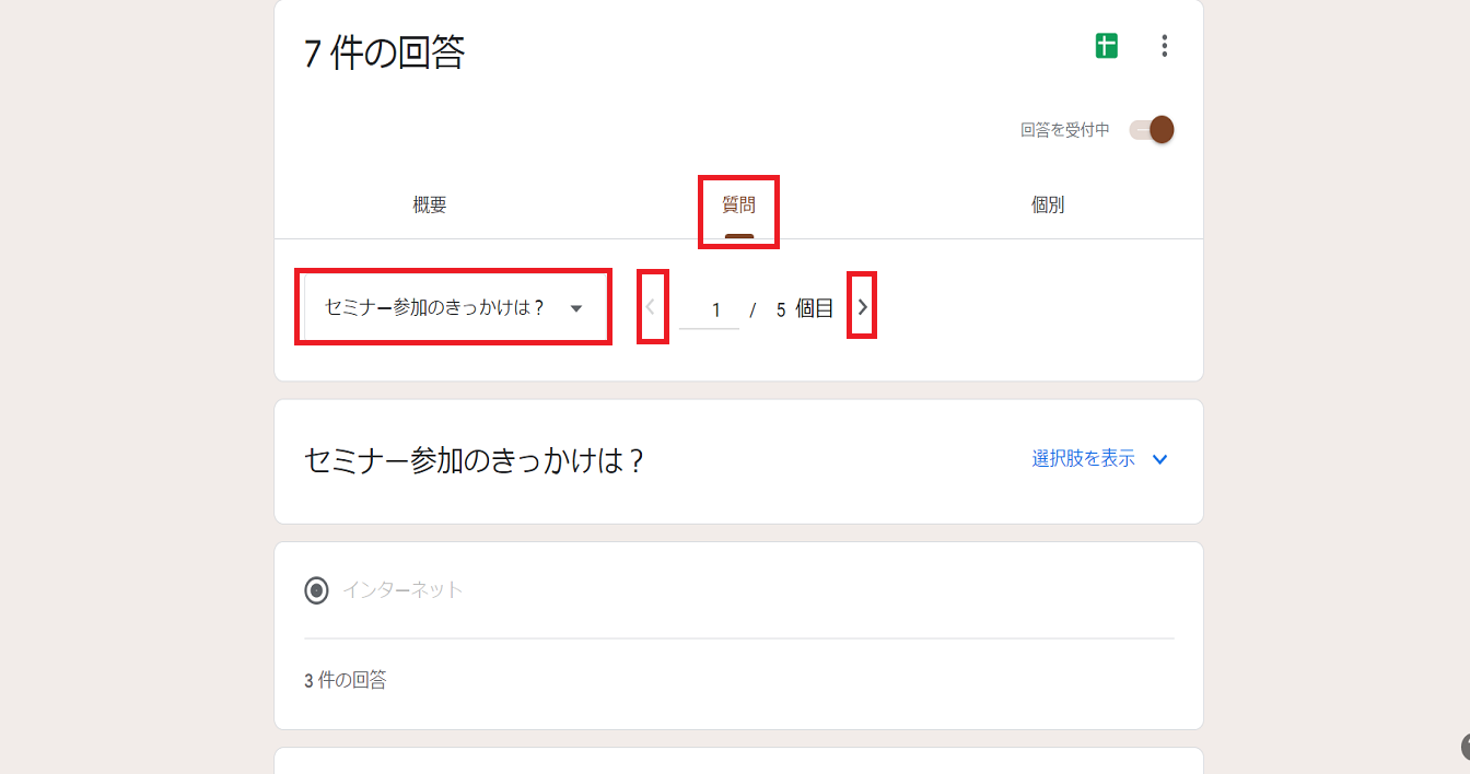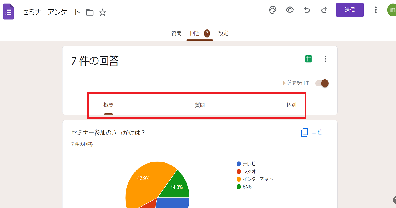 回答の隣にある数字が、現在フォームに回答が届いている数になります。