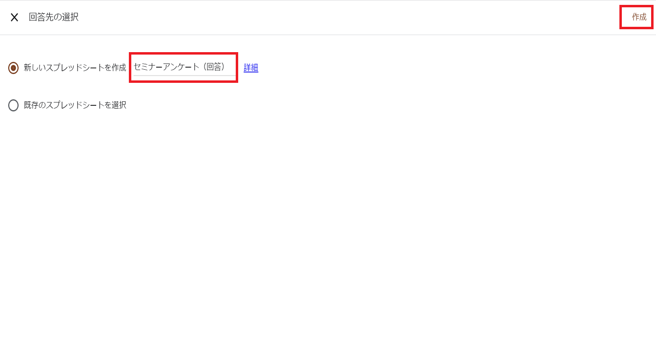 回答結果の出力先を「新しいスプレッドシート」か「既存のスプレッドシート」どちらかを選択し「作成」をクリックします。