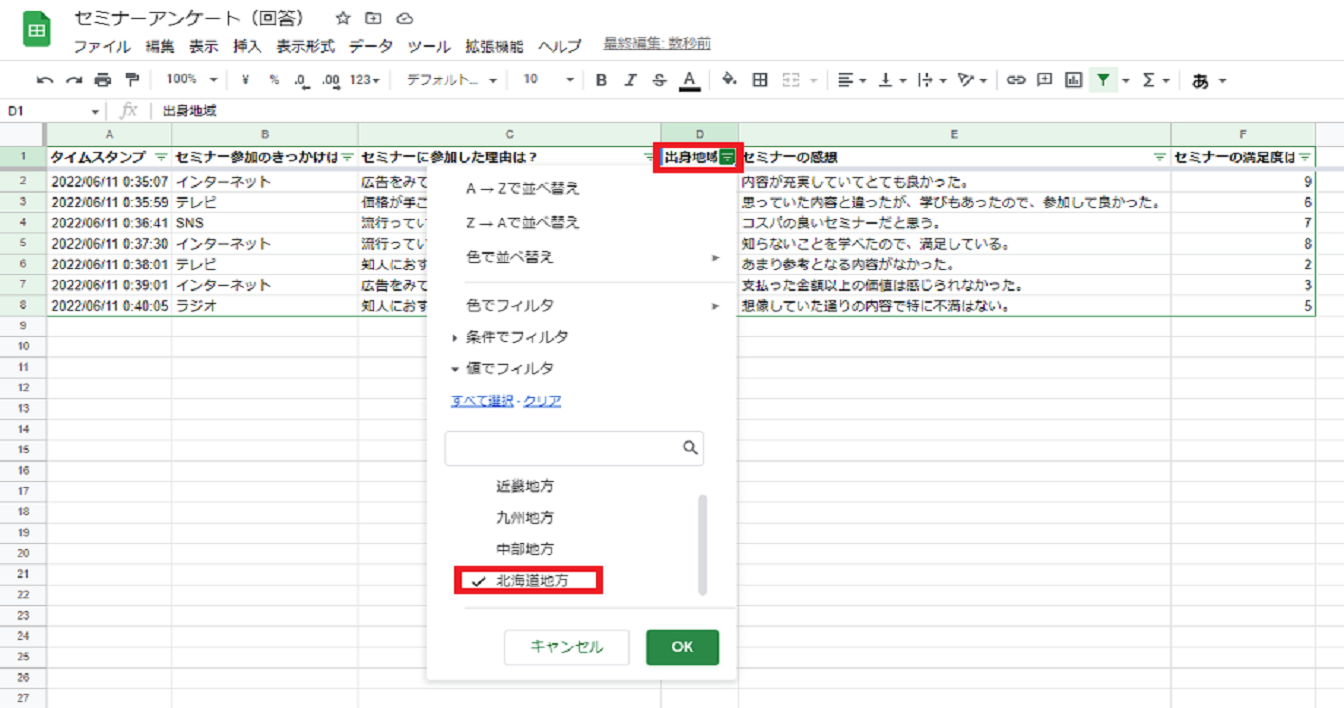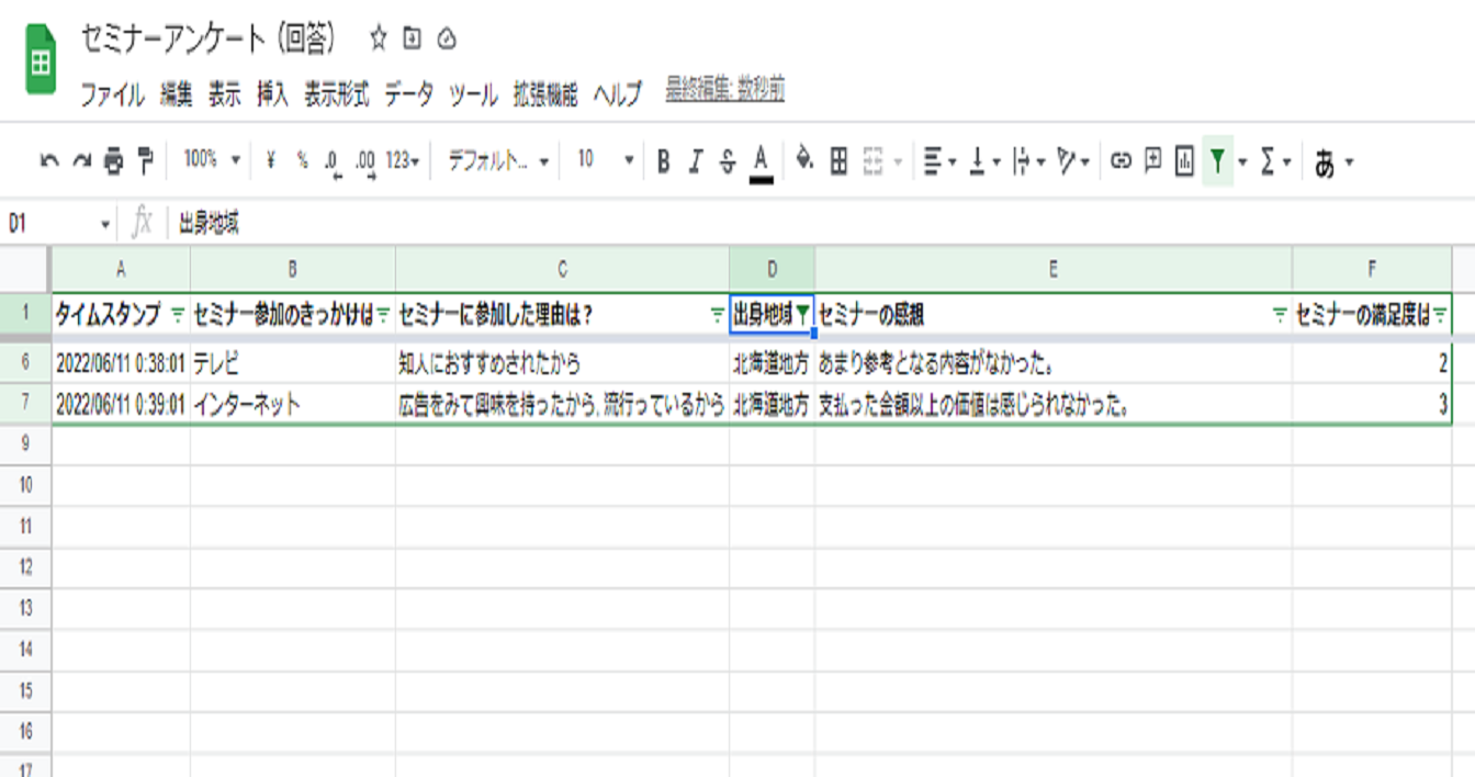 スプレッドシートはExcelと同様に使用できるため、フィルタをかけて特定の回答内容に絞って回答内容を確認することもできます。