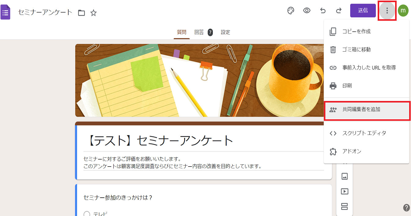 まず共有したいアンケートのフォームを開いて、右上の「︙」クリックしその次に「共同編集者を追加」 をクリックしてください。