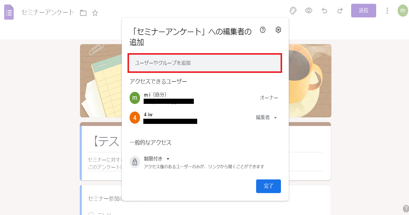 Googleフォームは企業でも活用できるサービスのため、複数人で使用することも想定した機能も備えています。