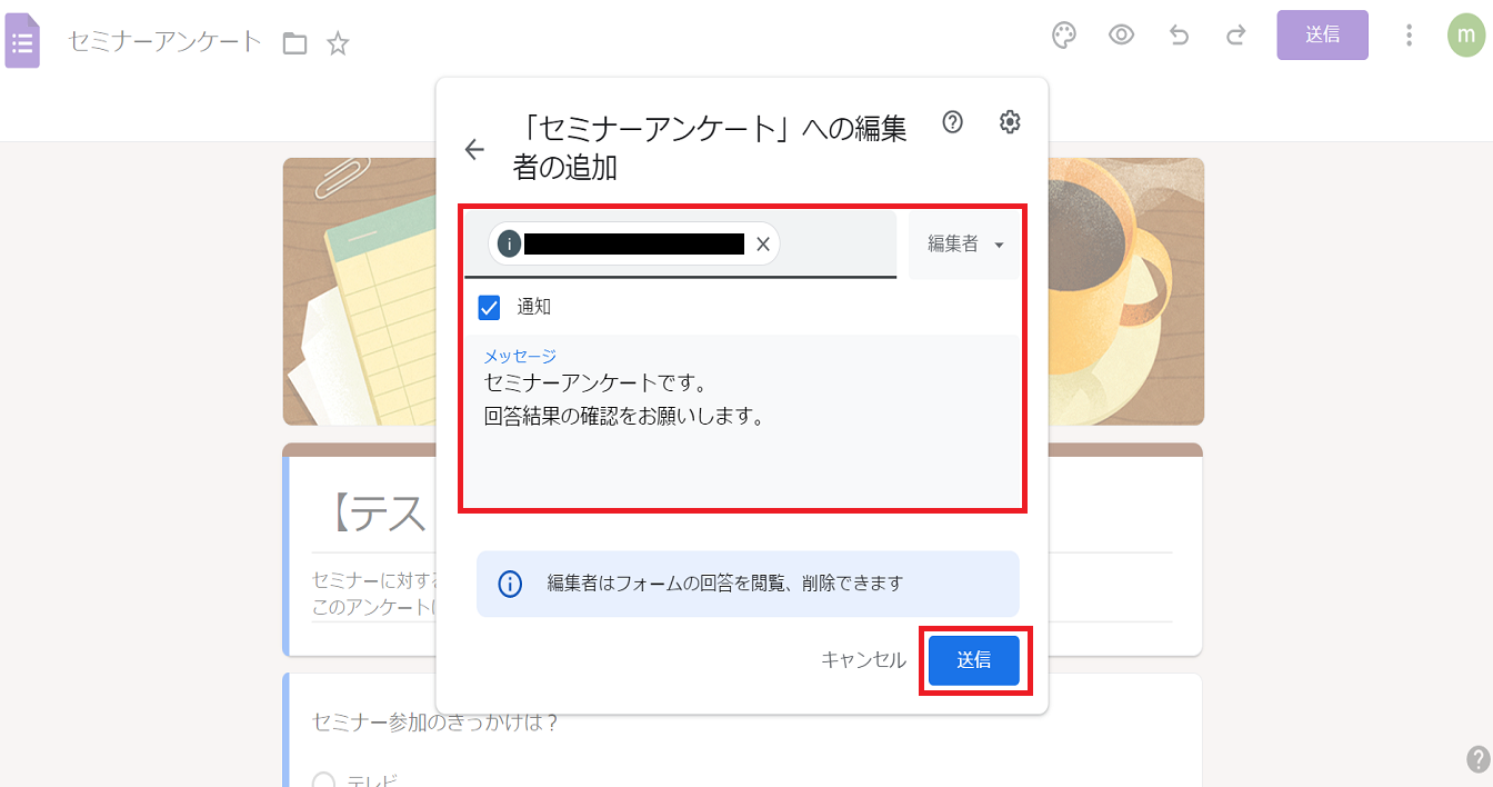 こちらの画面で、アンケートフォームを共有したい方のアドレスを選択・追加し、「送信」をクリックしてください。