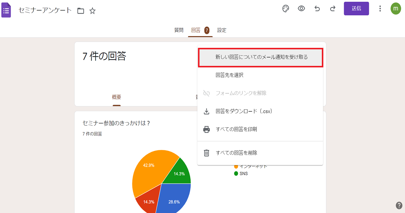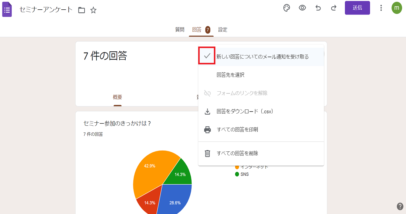 回答の画面で、右上の「︙」クリックし、「新しい回答についてのメール通知を受け取る」を選択すればメール通知が有効となり、作成しているGoogleアカウントのアドレスに回答があった際、通知が届くようになります。