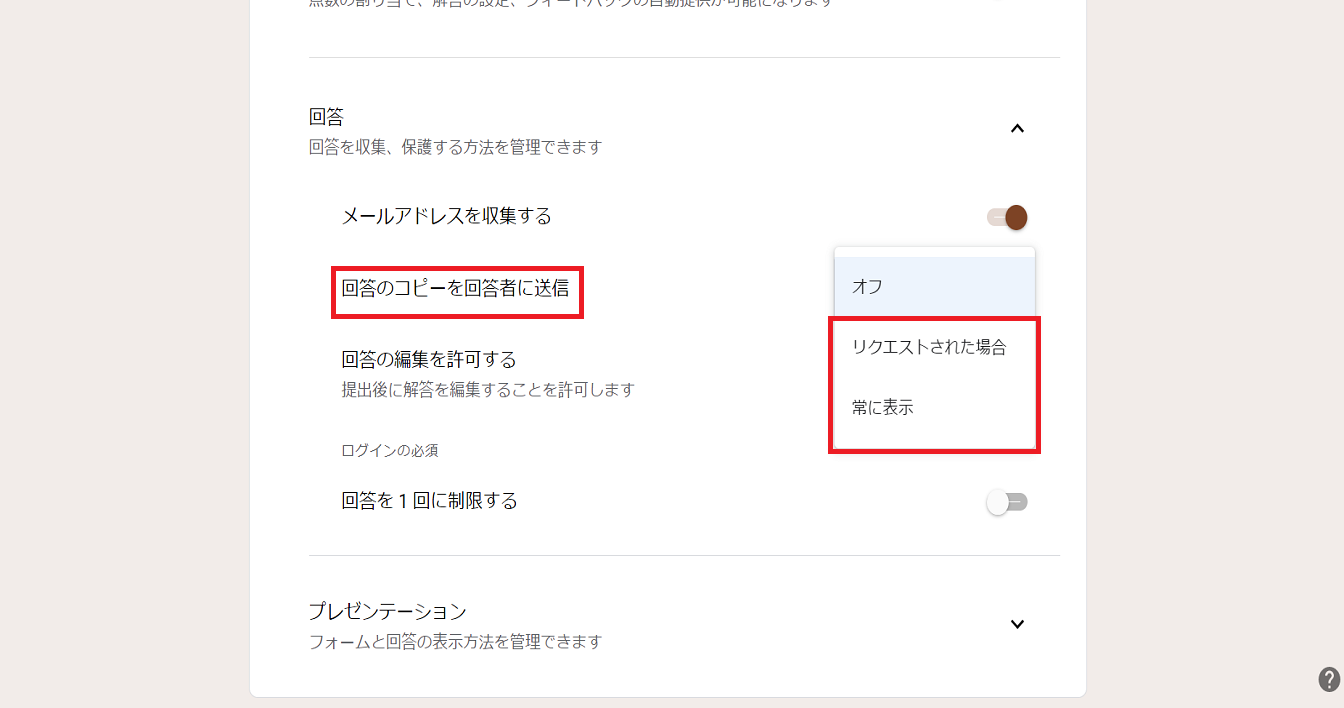 回答の項目を開いて、「メールアドレスを収集する」をオンにして、「回答のコピーを回答者に送信」を「回答者がリクエストした場合」もしくは「常に表示」どちらかを選択します。