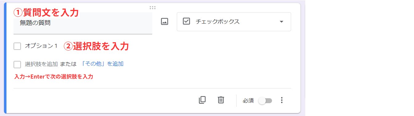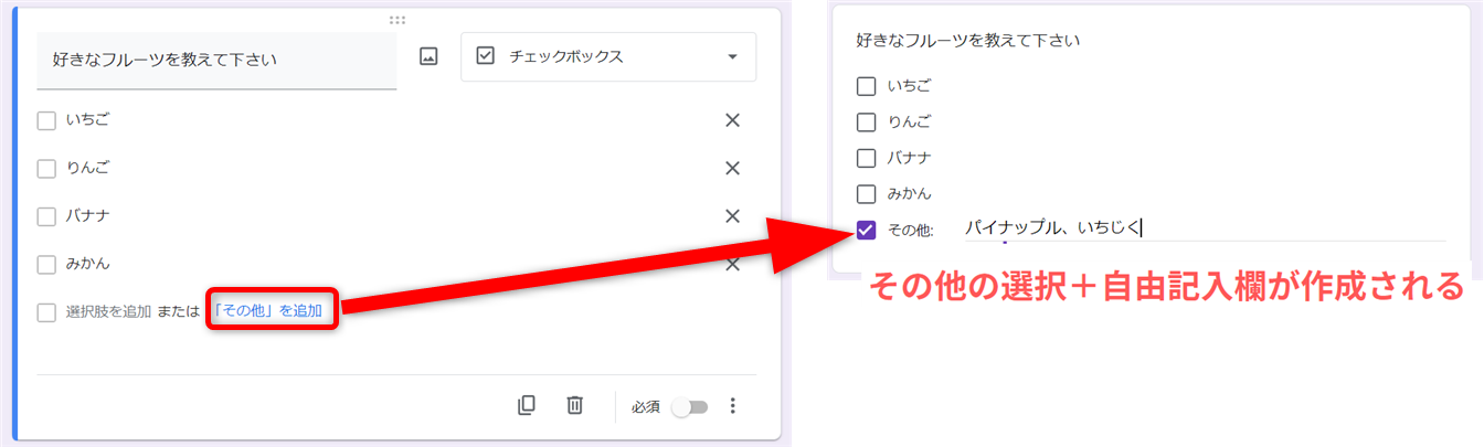 [「その他」を追加]をクリックすると、その他の選択肢と自由記入欄が作成されます。