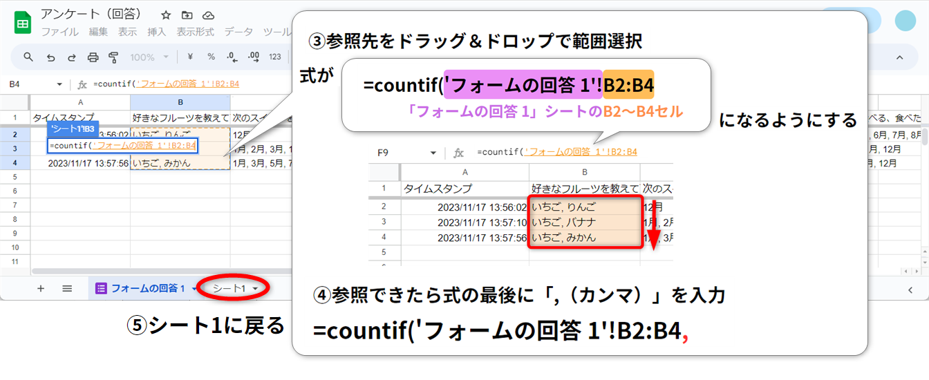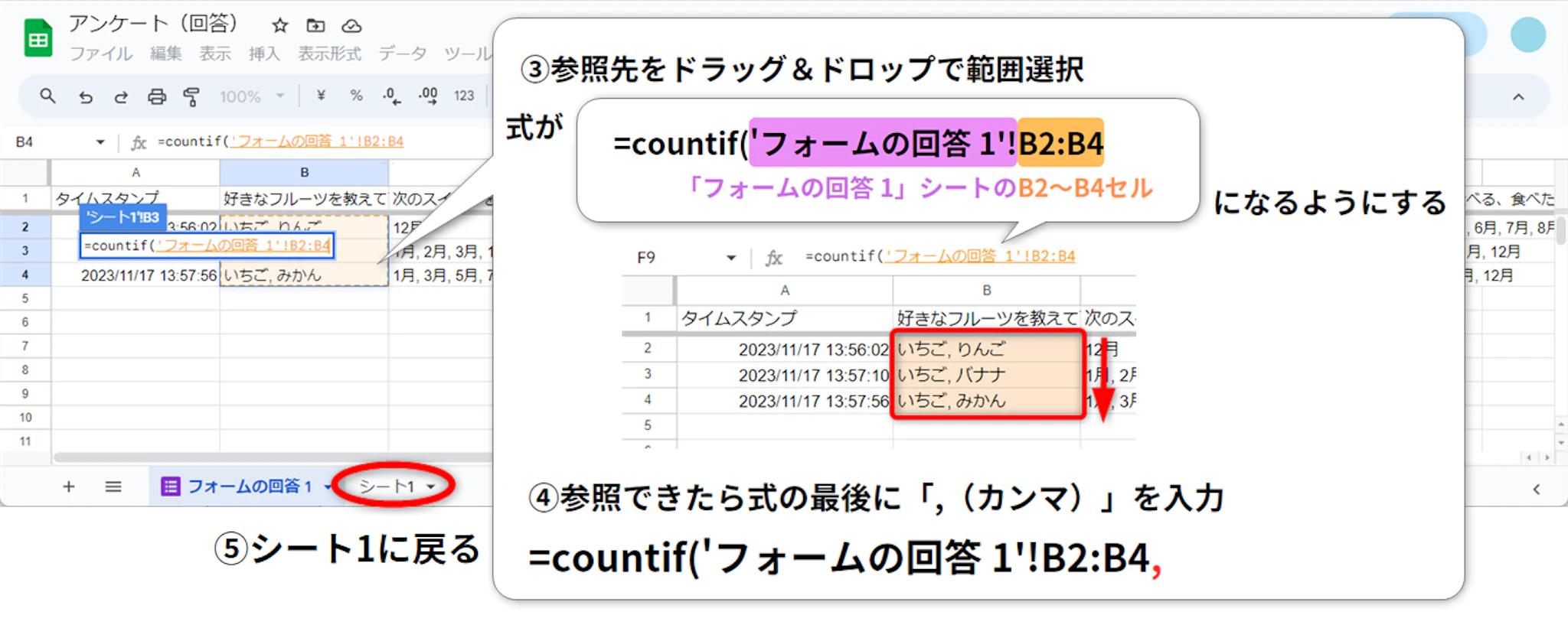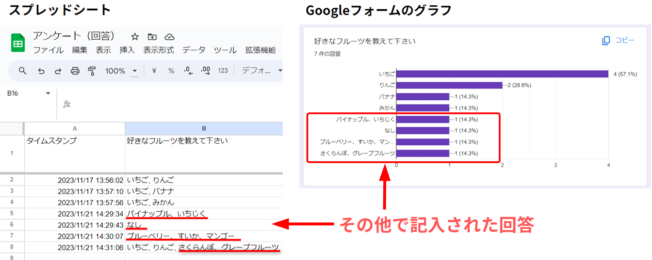 「いちご,りんご」「いちご,みかん,バナナ」と複数回答したときのいちごの数もカウントできるようにしましょう。