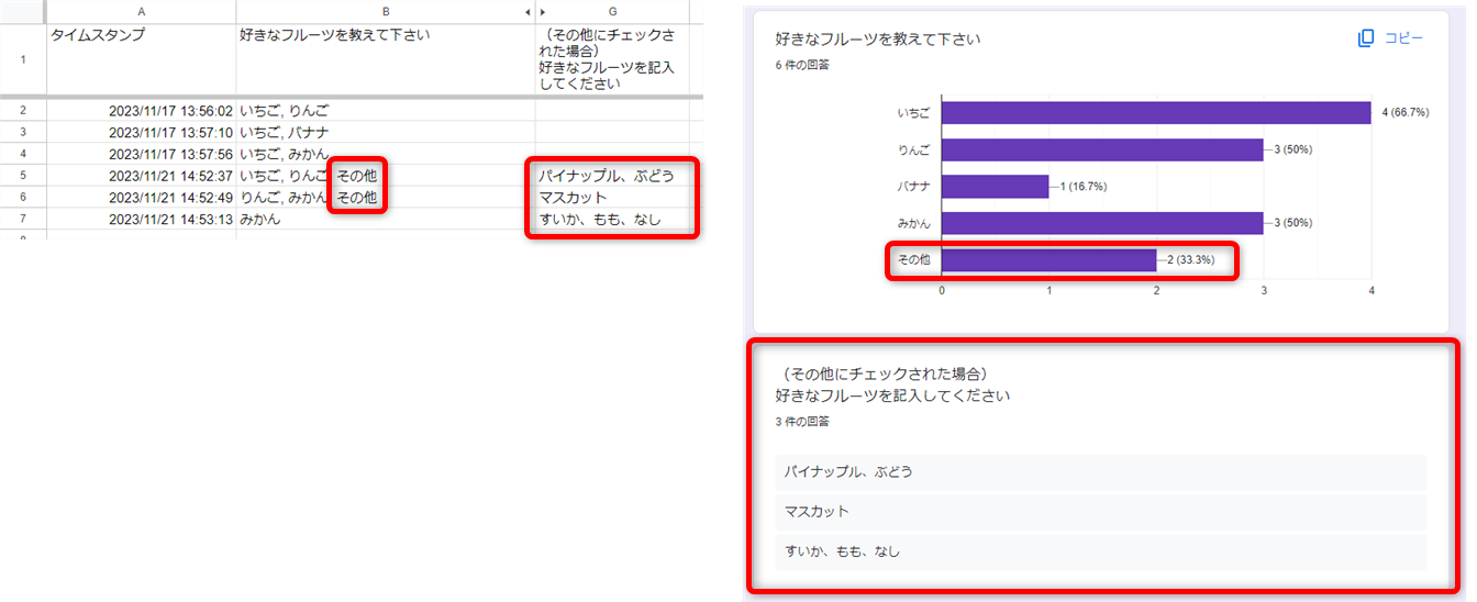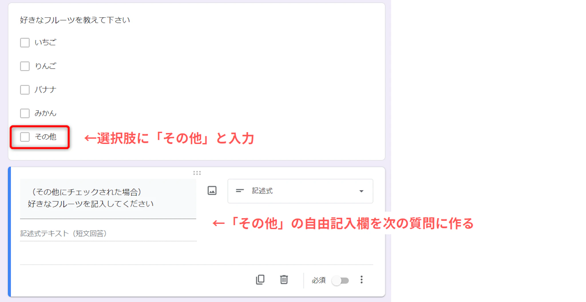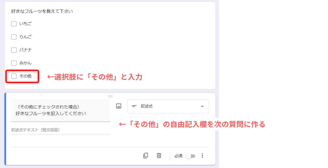数十人以上が回答するようなアンケートでは集計作業が極端に複雑化するため、国際的なユーザーフォーラム等でも「『その他』の自由記入は別問に切り分けるべき」というノウハウが共有されています。その他の選択肢を使いたい場合は、その他の質問を別にすることをおすすめします。