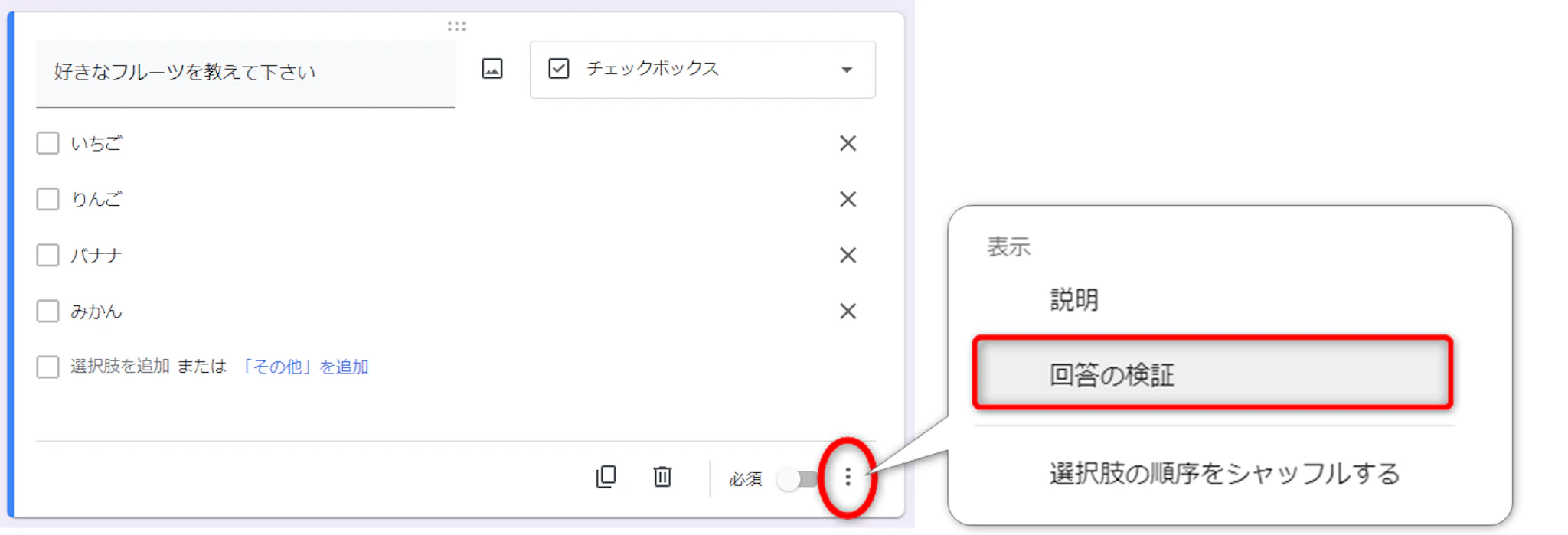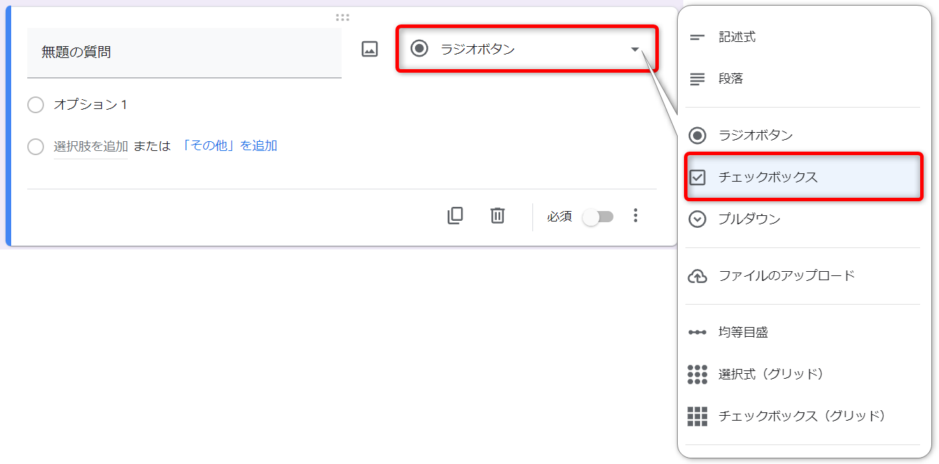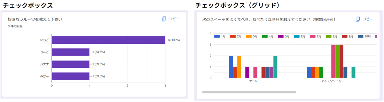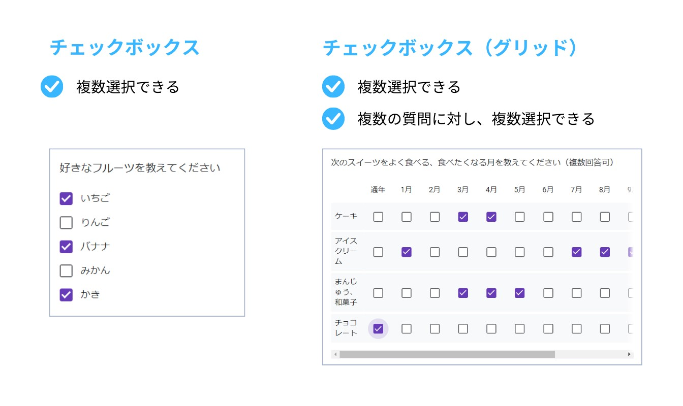 Googleフォームには、一つの質問に複数の回答を選択できる「チェックボックス」という質問形式があります。