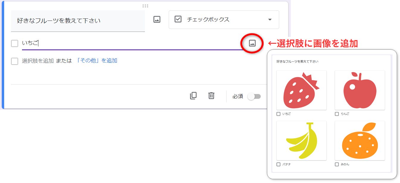 選択肢に画像を追加するには、選択肢右側にある[画像アイコン]をクリックし、画像をアップロードしましょう。