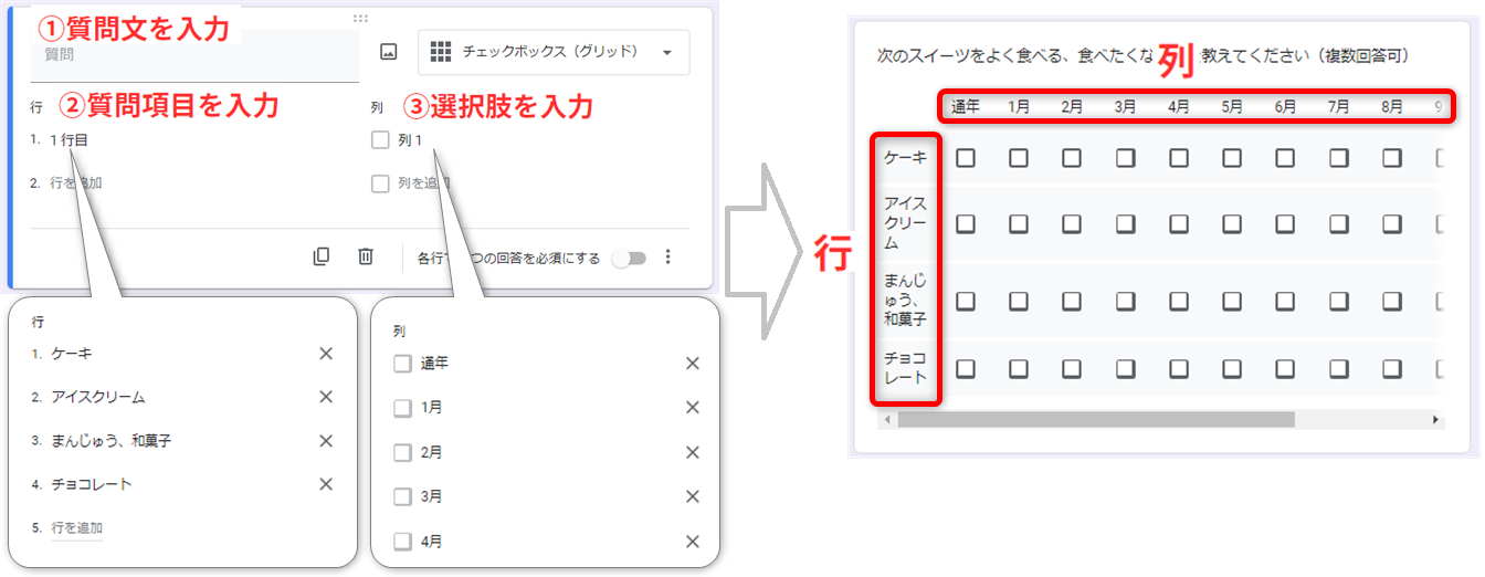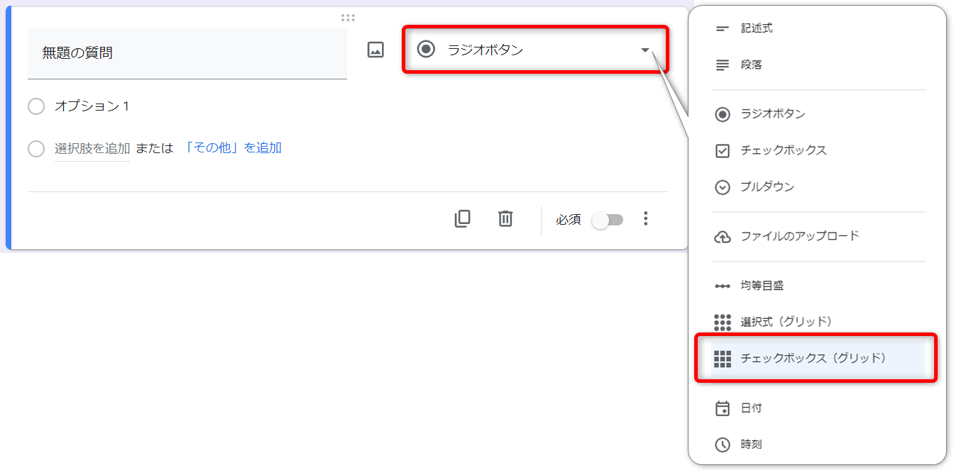 チェックボックス(グリッド)は、いくつかの質問に対して、同じ選択肢を提示するときに使うと良いでしょう。
