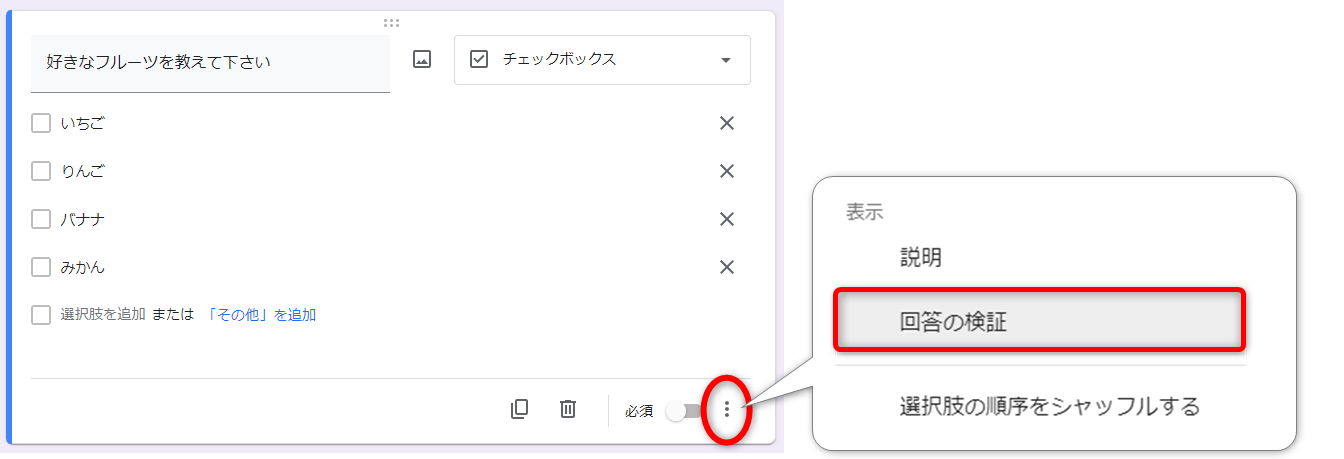 必須回答にするには、質問の右下にある[必須]をクリックします。